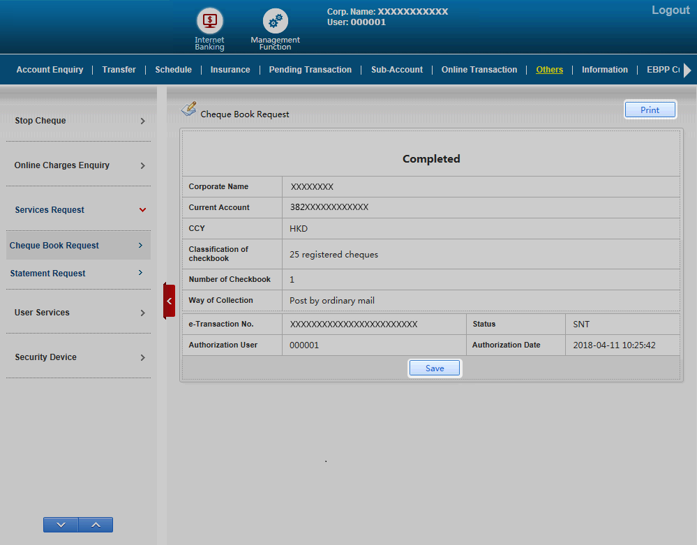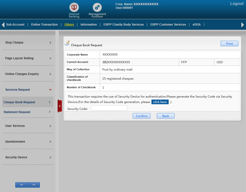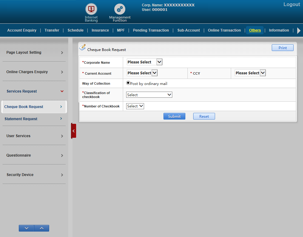 Please select Service Request under Others and then select Cheque Book Request for further action. Please input all information required and press Submit to continue.