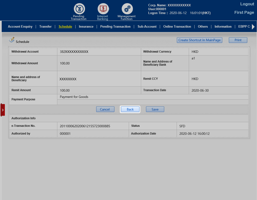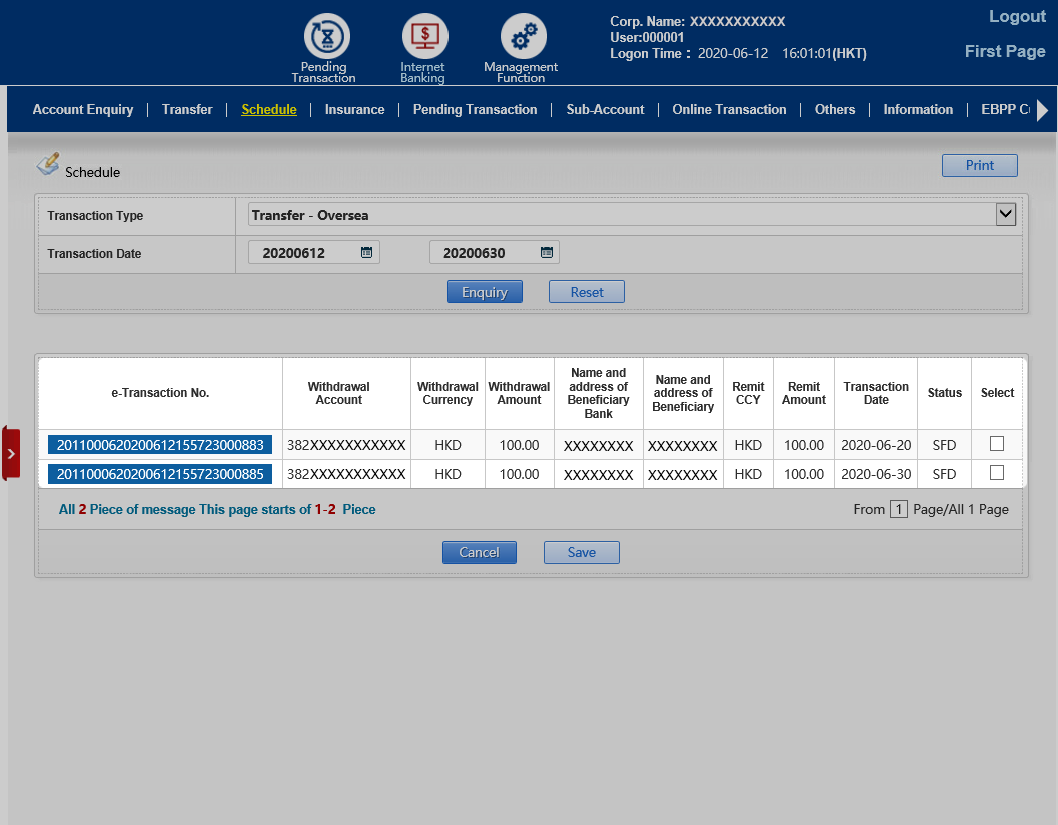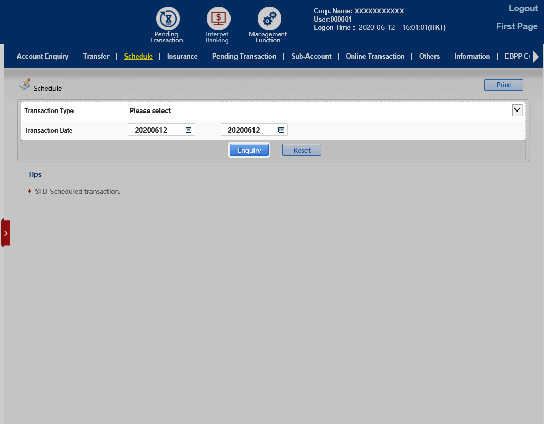 ****Transactions Only with the status of "FSU" (Non-business hours submitted transaction) or "SFD" (Not yet executed Schedule transaction) are available for Enquiry or Cancellation in Schedule.
