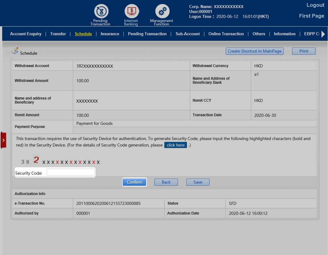 Please review the transaction details and input the Security Code as per the instruction shown. Then, select Confirm to proceed.