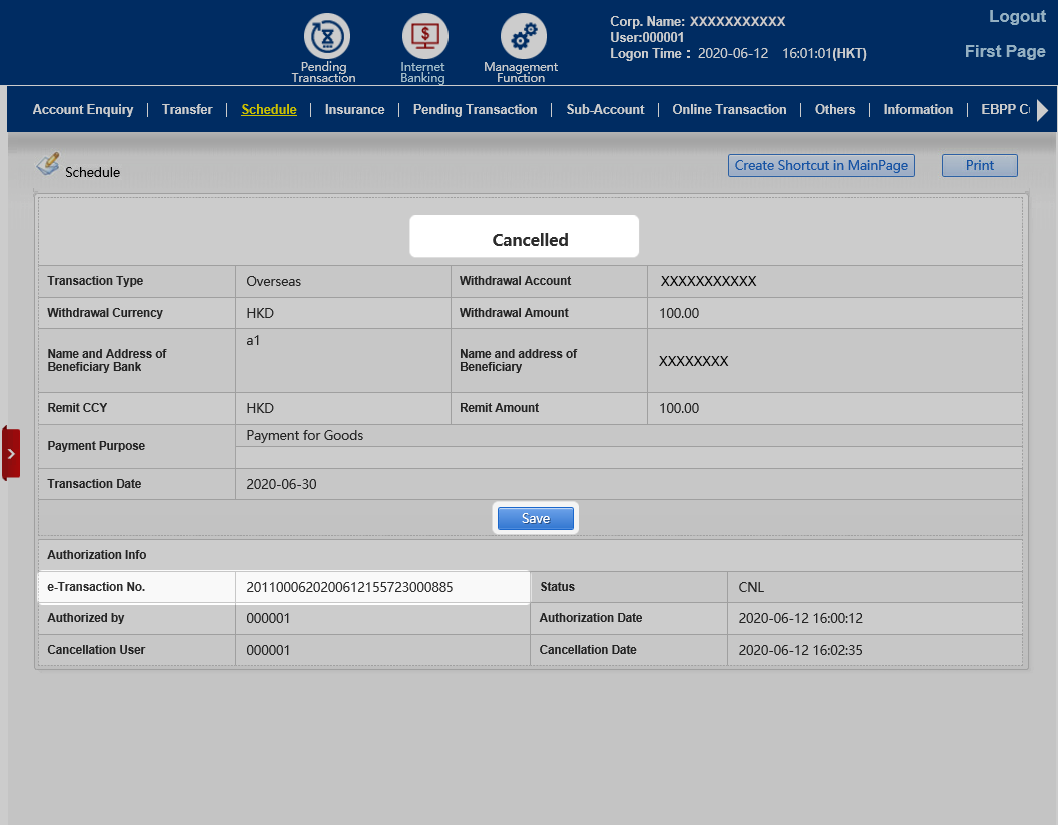 The window will display Transaction Cancelled and e-Transaction No. after the cancellation is completed. You may save the confirmation details by clicking on Save .
