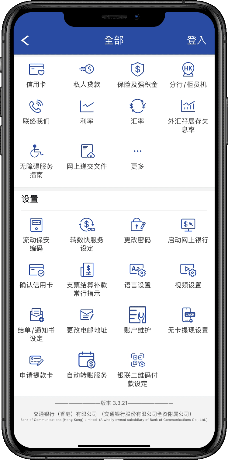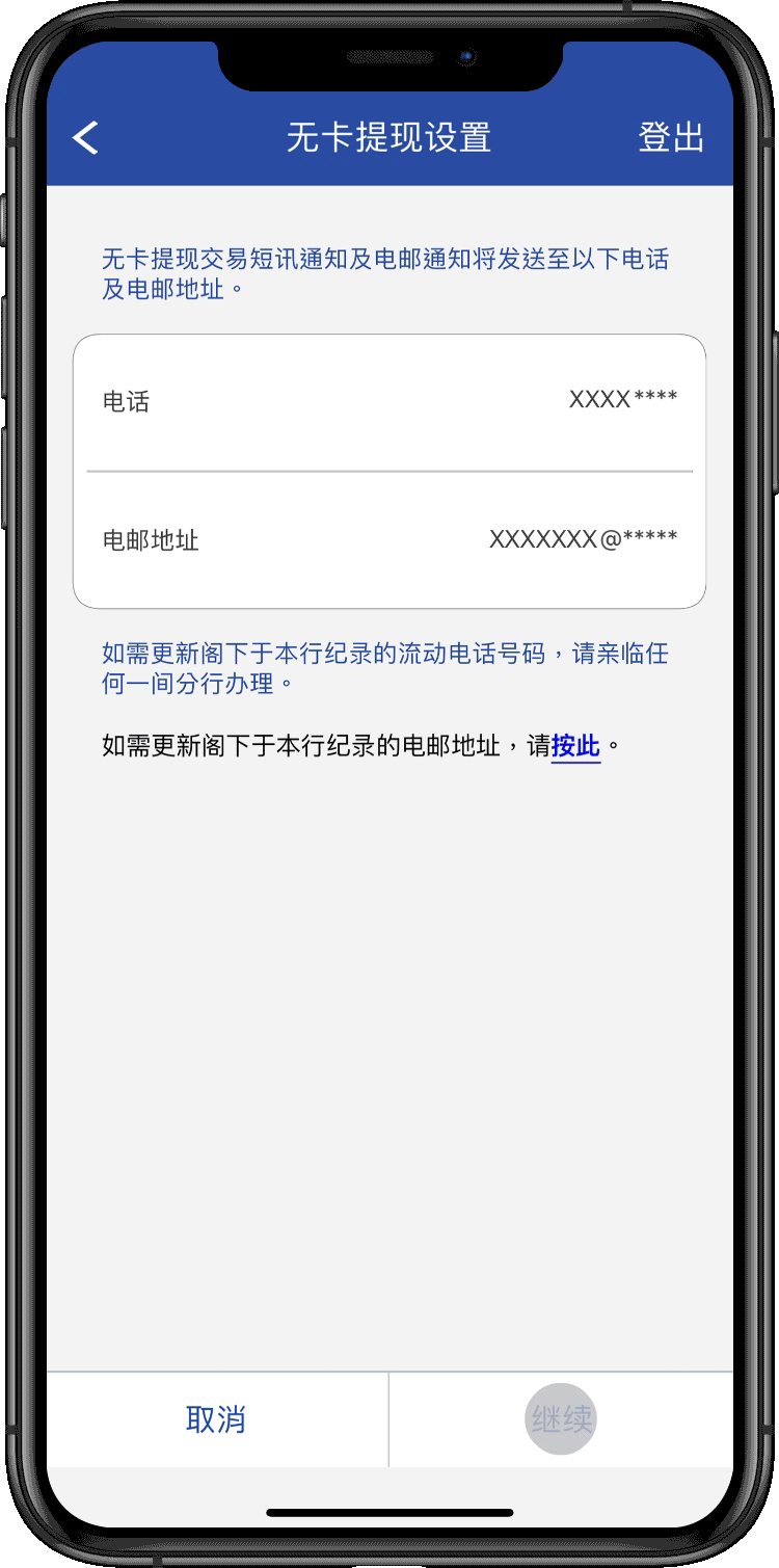 透过「交通银行(香港)」手机应用程式,以流动保安编码或生物认证登入。在目录中选择无卡提现设置。