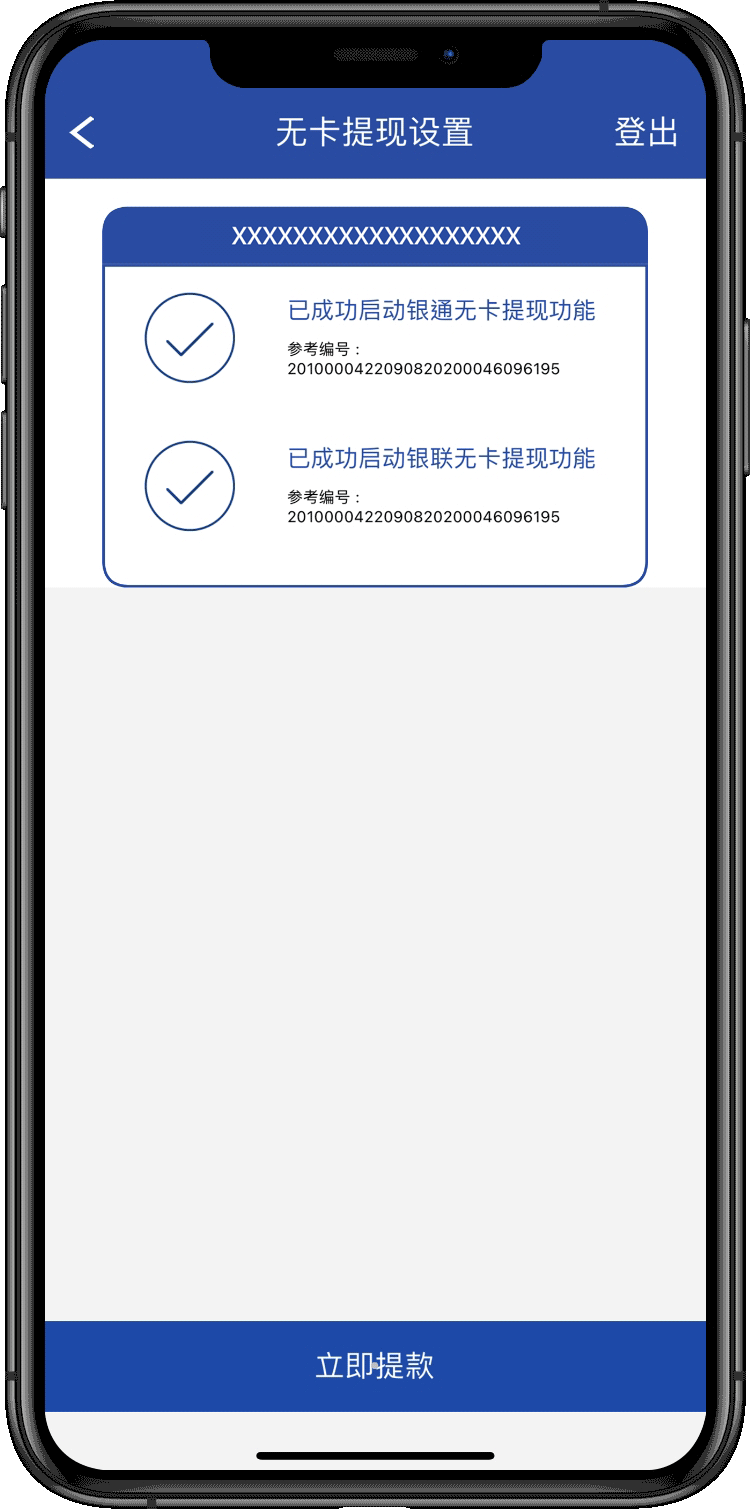 蓝框内指定提款卡的银通及银联无卡提现服务已成功启动。点选立即提款进行无卡提现服务。我们将会向您已登记的流动电话号码及电邮地址发送成功启动服务的短讯。