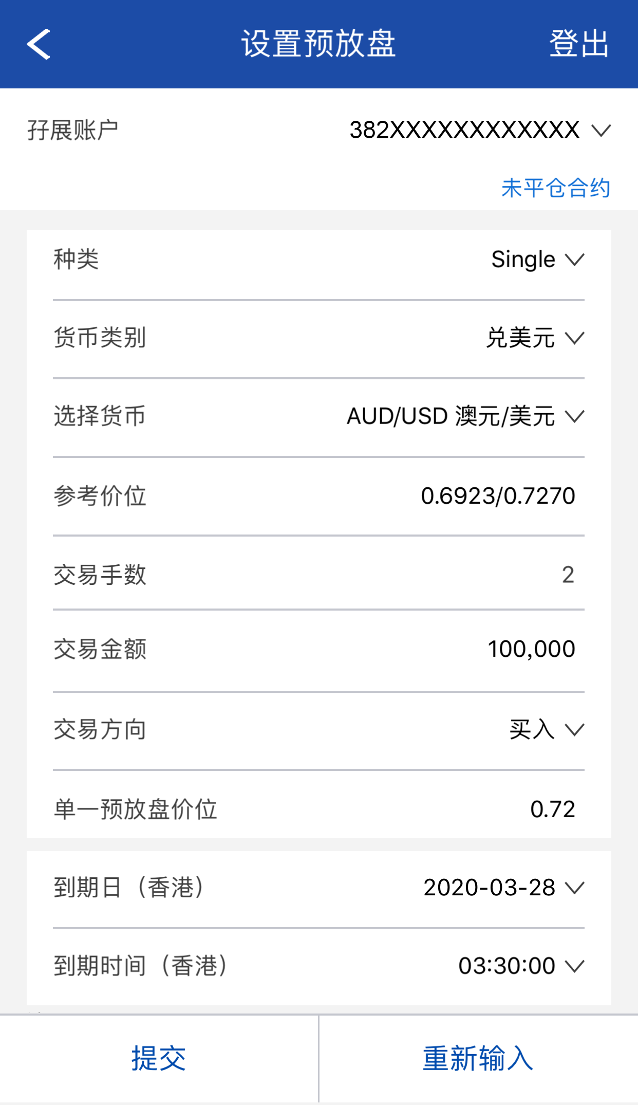 选择预放盘种类、货币类别、货币、交易手数及交易方向(买入或卖出)、输入预放盘价位、到期日及到期时间(香港),完成后按提交。如欲重设,按重新输入。