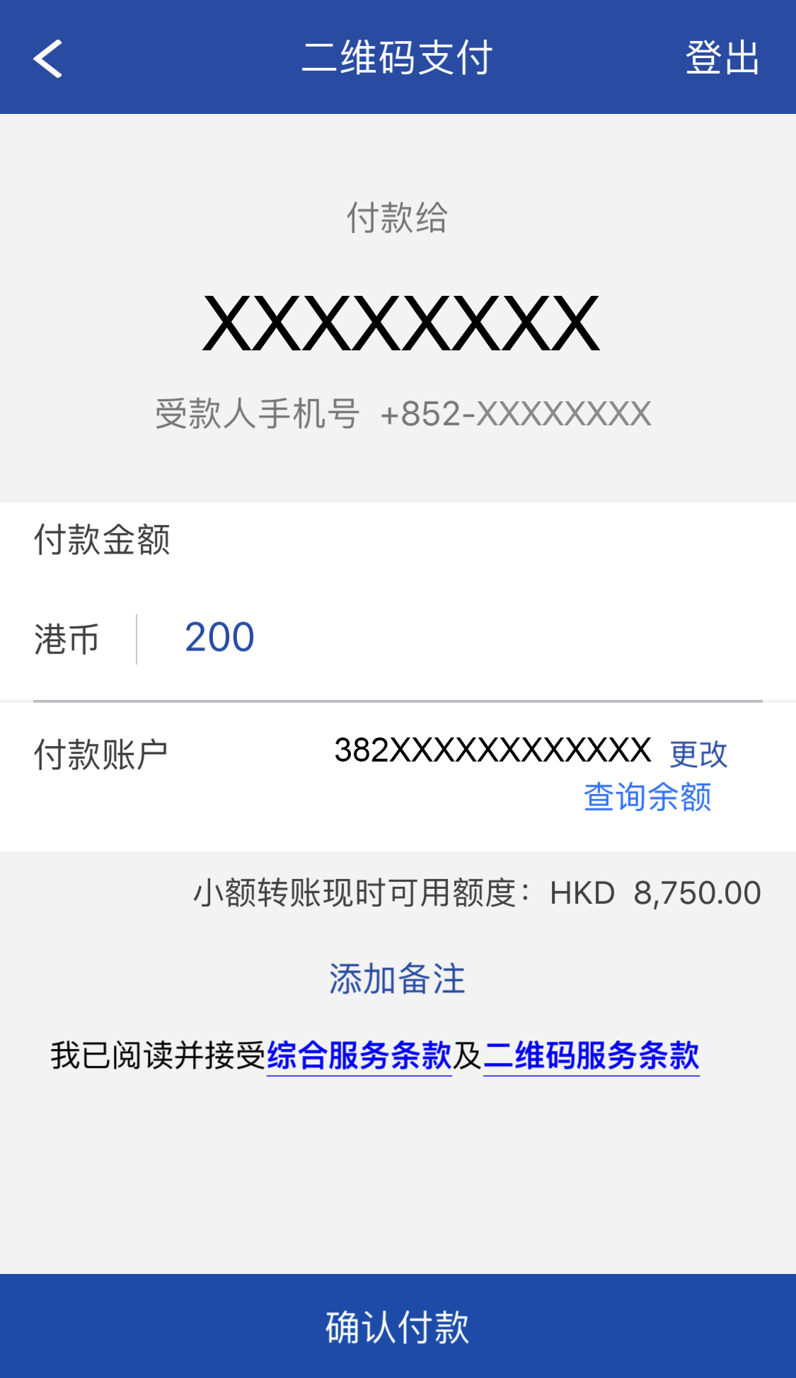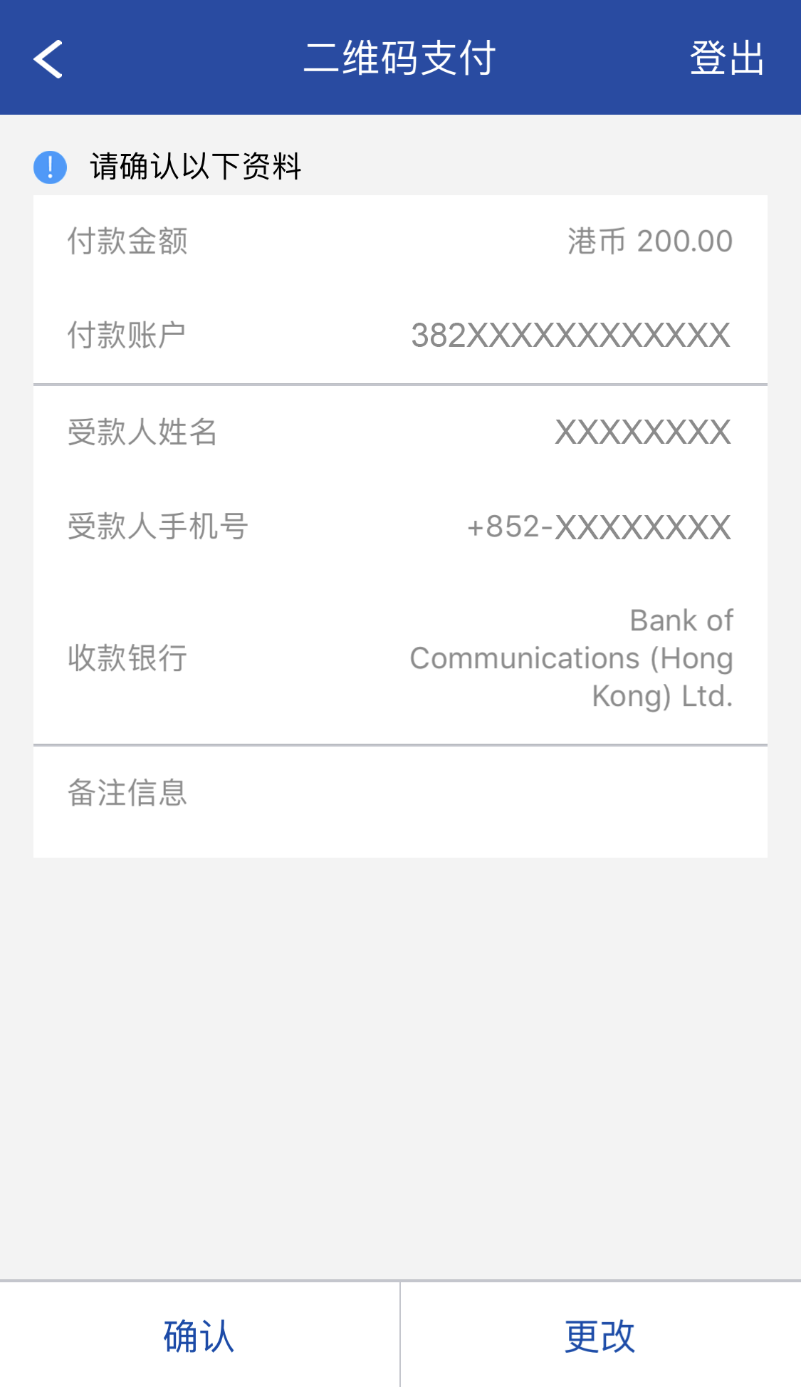 成功扫瞄后, 页面显示付款交易资料予客户确认。 客户可按更改选择其他付款账户,或按确认付款。