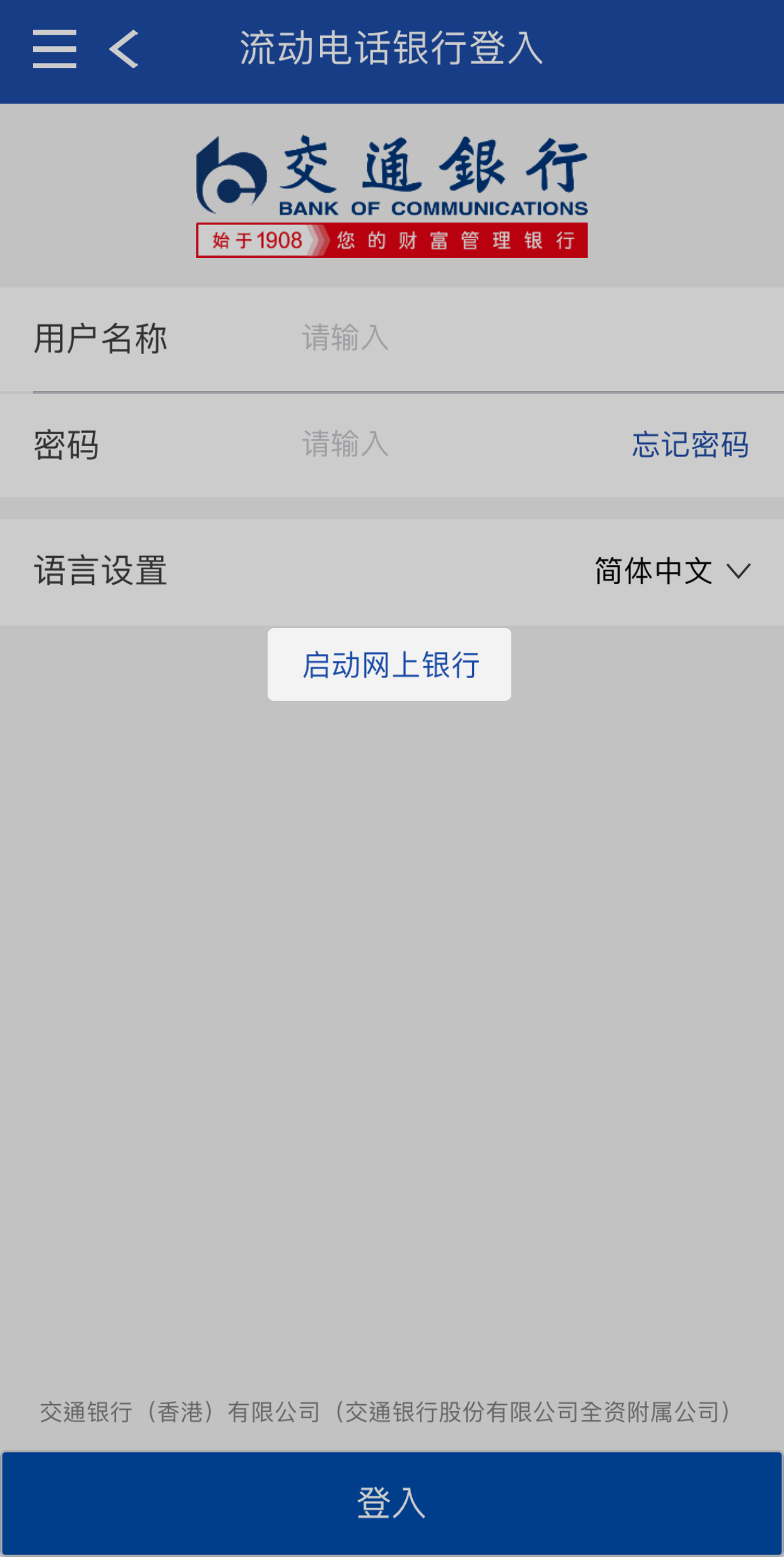 于交通银行(香港)手机应用程式主页按「启动网上银行」功能,设定用户名称及密码后,便可使用流动电话银行及网上银行服务。