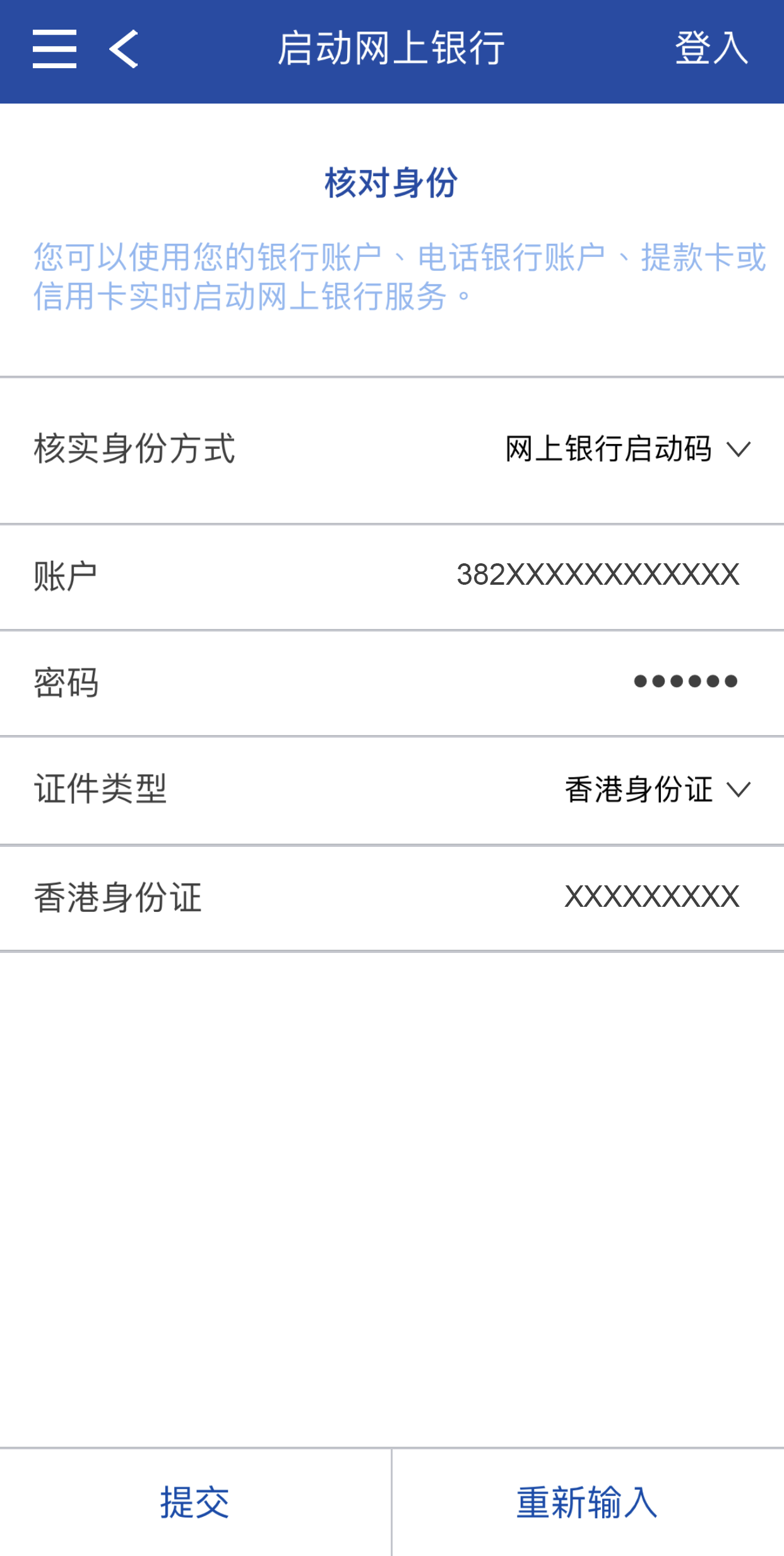 于网点领取密码函的客户,请选择以网上银行启动码作为核实身份方式,客户亦可选择以提款卡号码、信用卡号码或电话银行服务作为核实身份方式,再按页面要求输入所需资料。