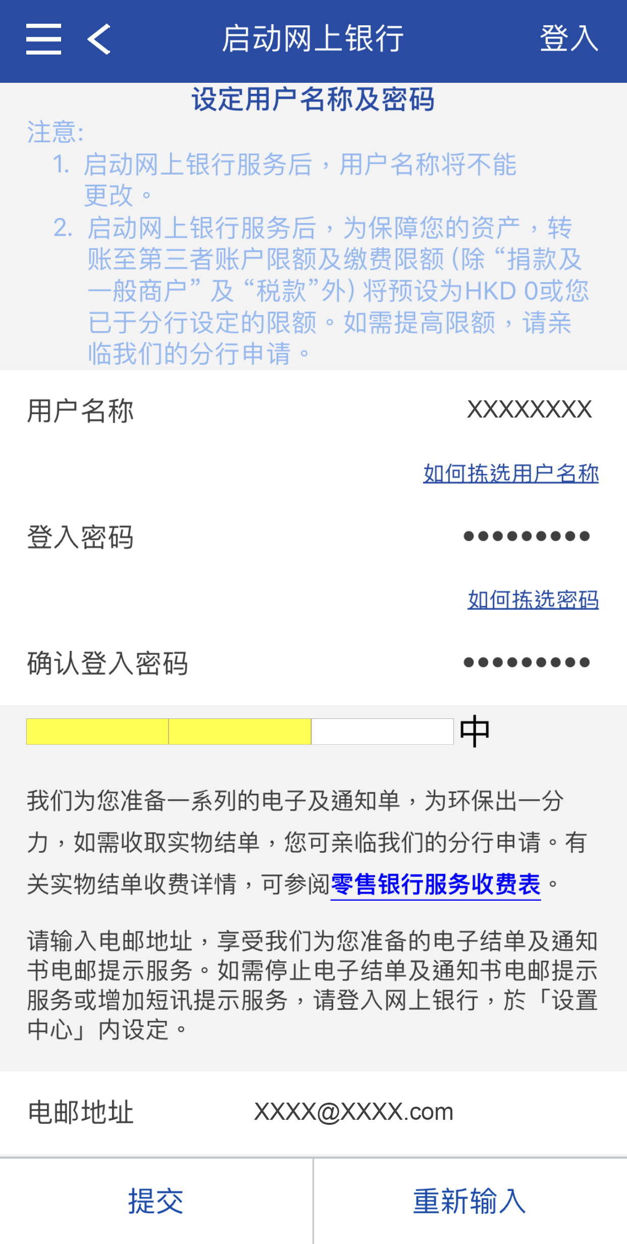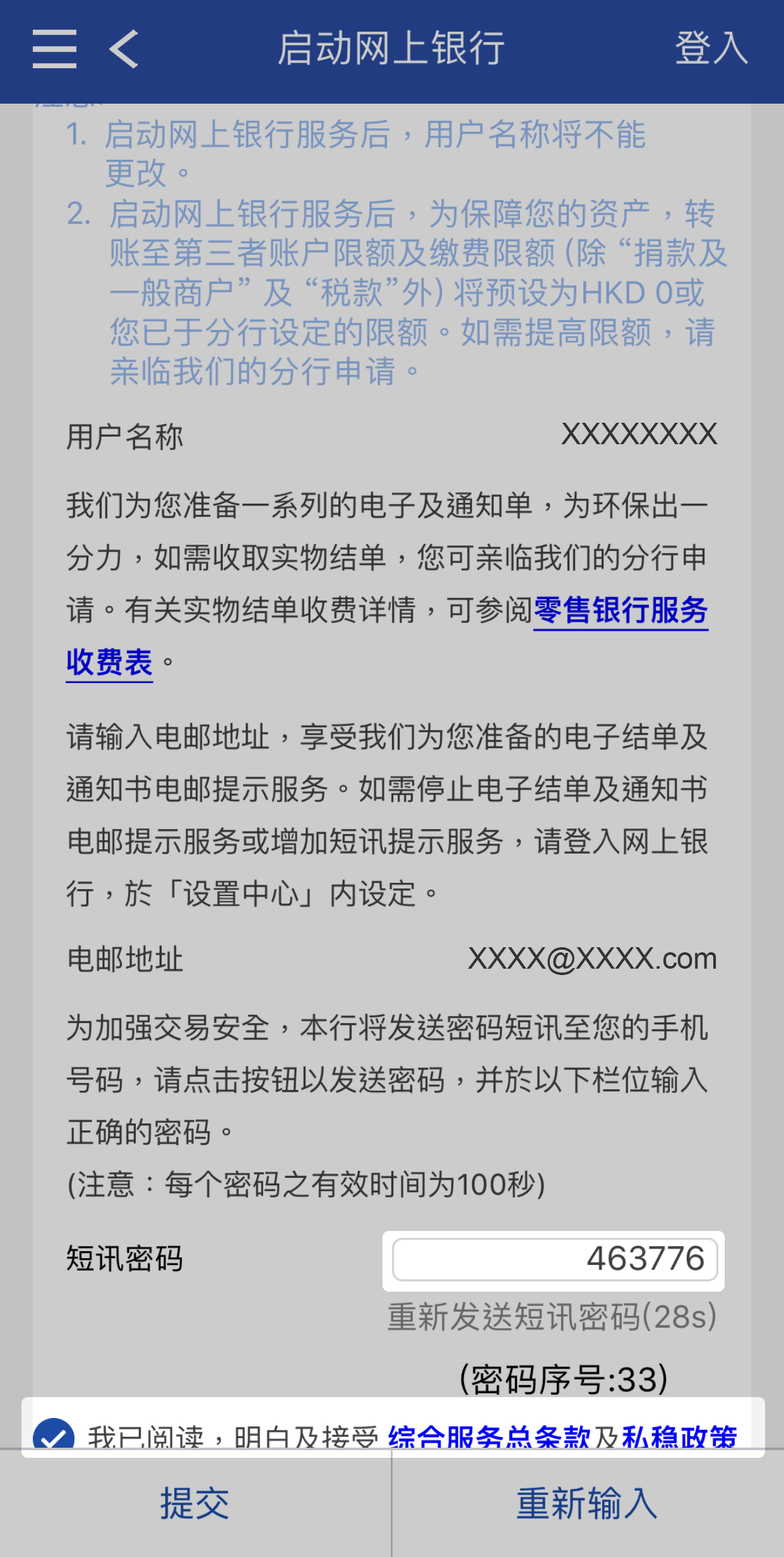 为确保交易安全,请使用短讯密码进行认证,然后点撃确认你已阅读「综合服务总条款」及「私隐政策声明」有关网上银行服务的条款及细则,再按「提交」。