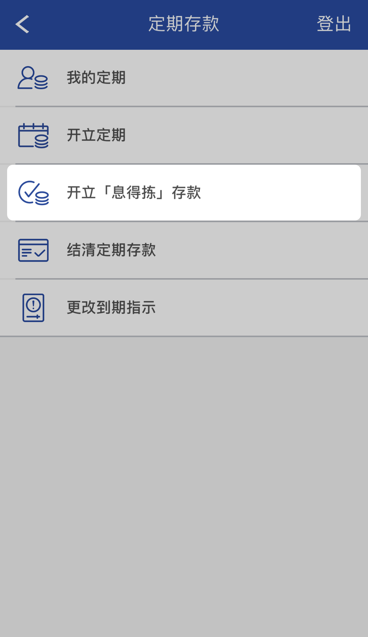 登入「交通银行(香港)」手机应用程式选择理财 > 定期存款 > 开立「息得拣」存款。