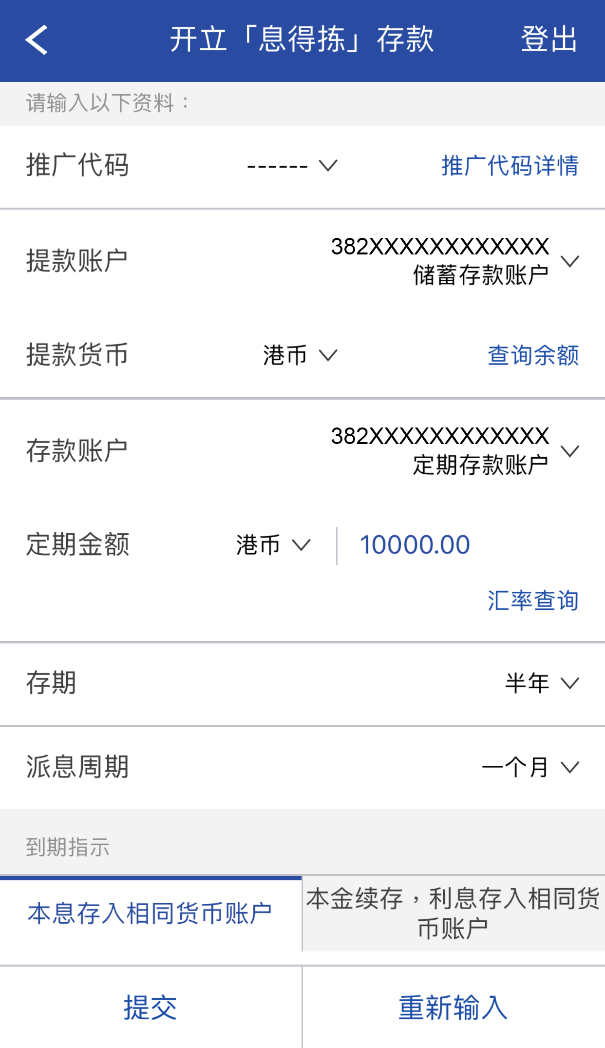 于页面选择或输入所需交易资料按提交,您可直接于开立「息得拣」存款同时进行外币兑换。