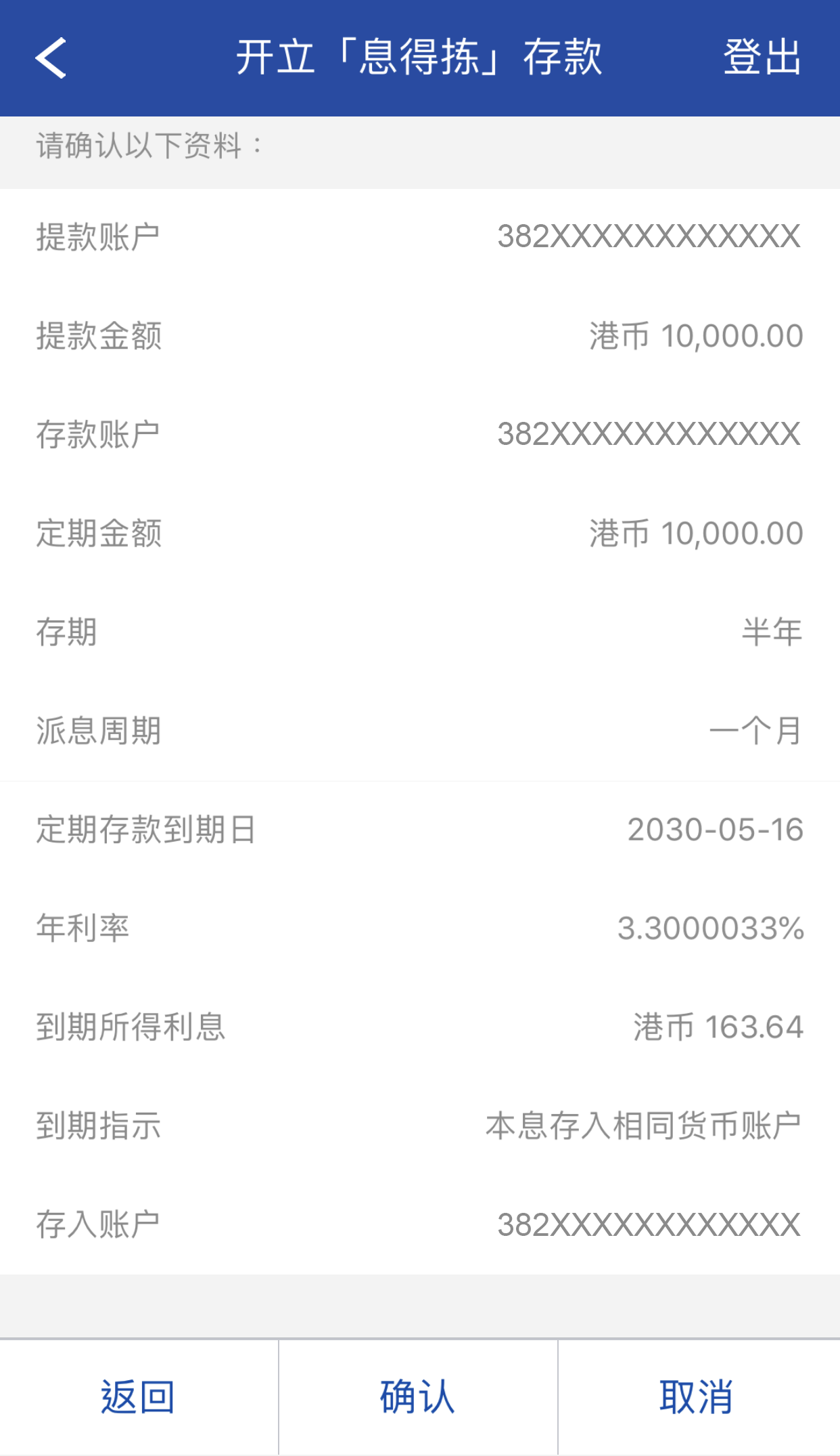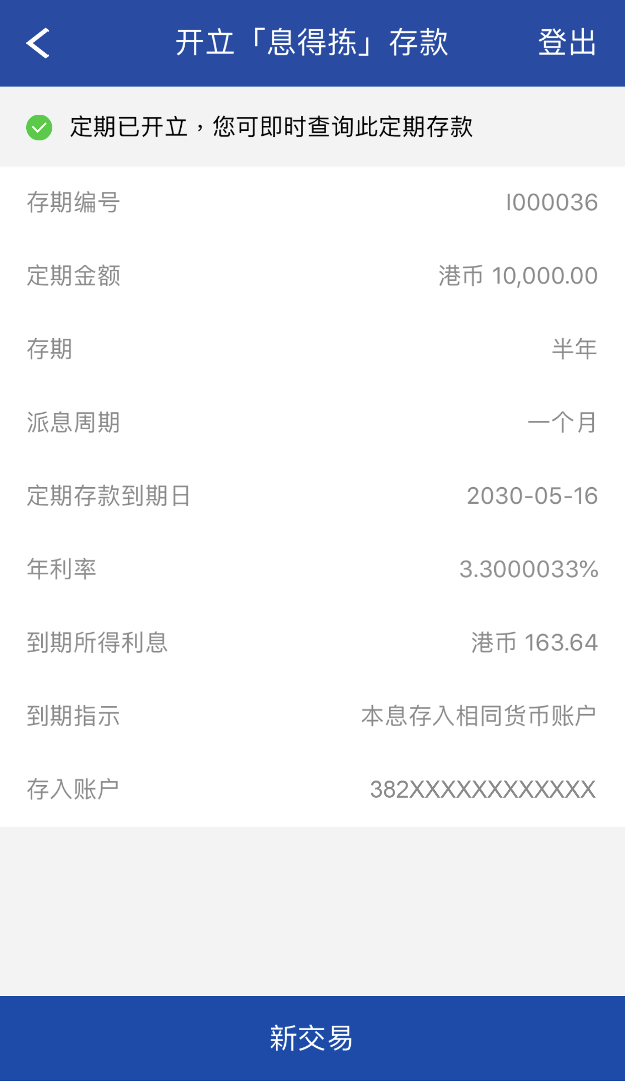 交易完成后,版面将显示存款编号。您亦可于我的定期功能查询定期存款详情。