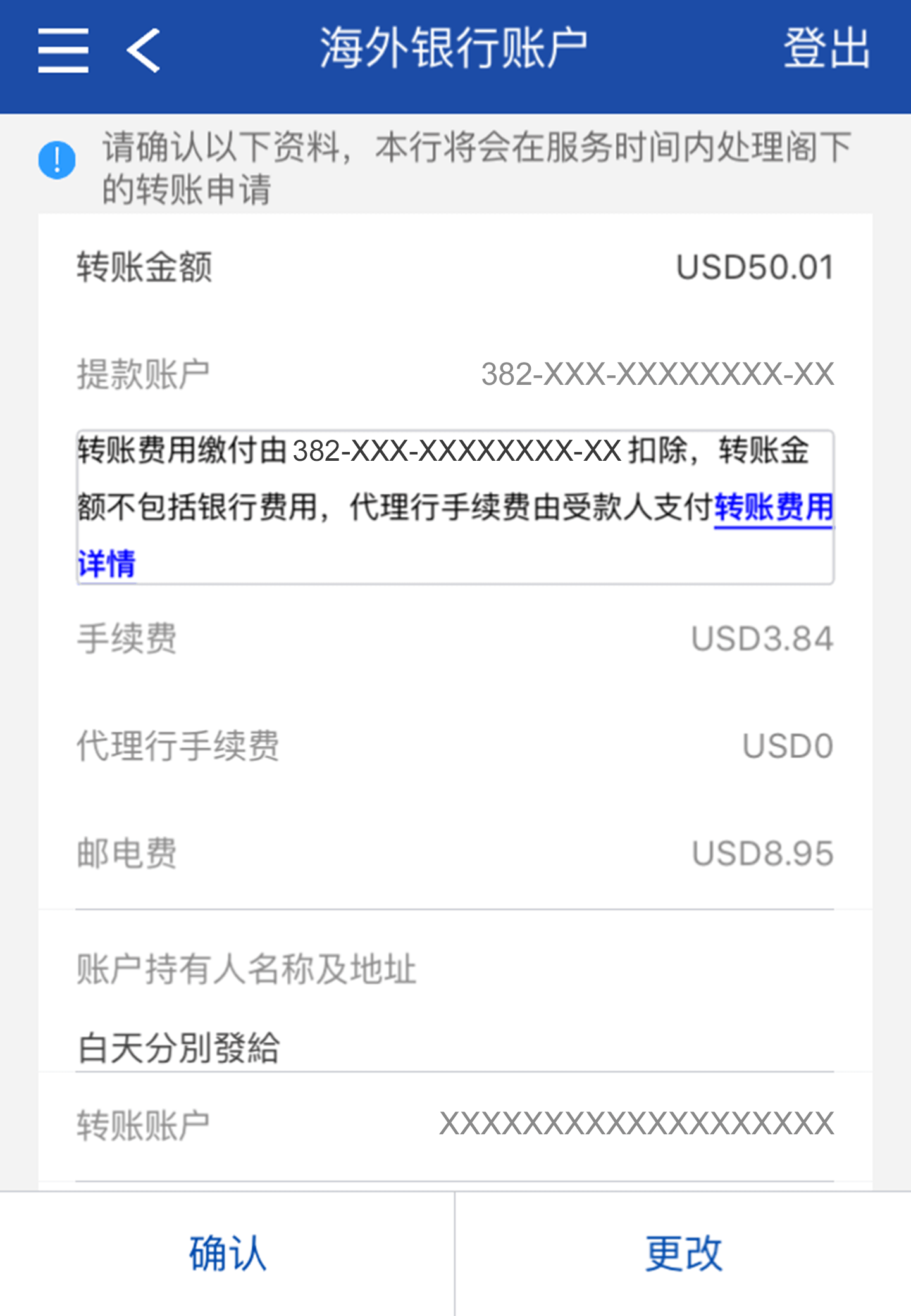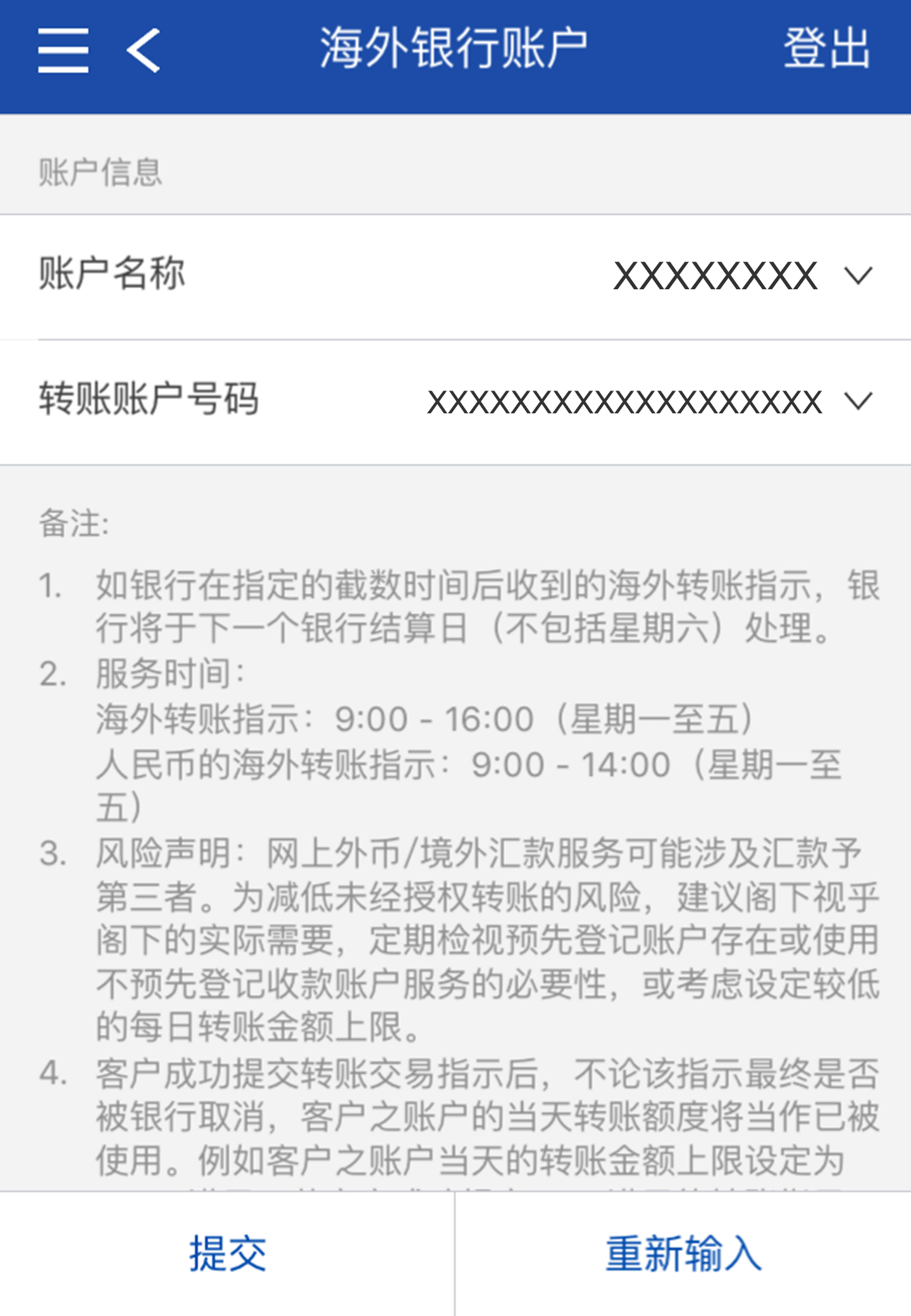 于转账选择海外银行转账,然后于右方位置选择或输入所需交易资料,再按提交。