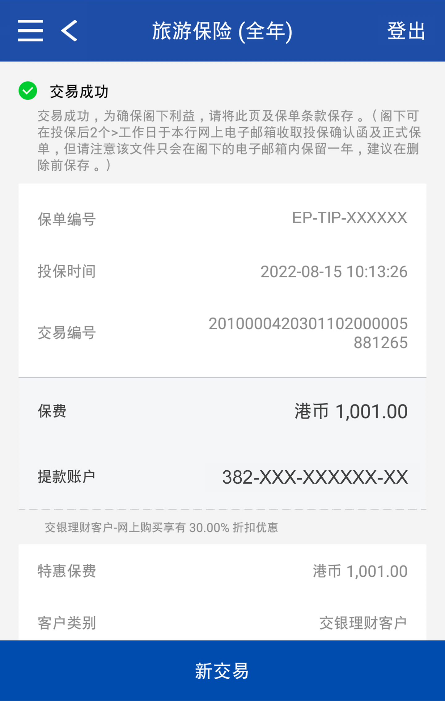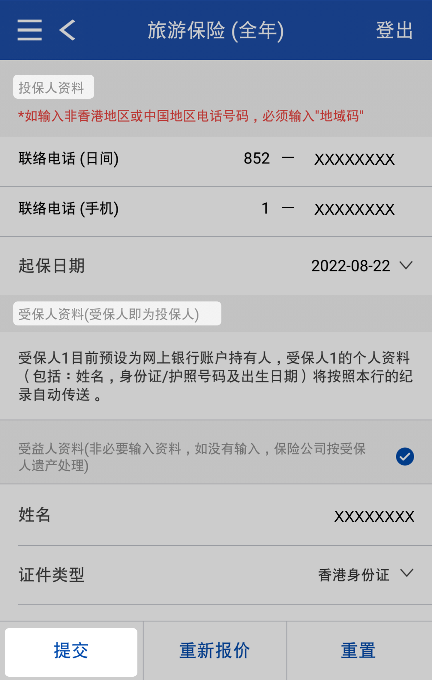 输入投保人资料、受保人资料并选择提款账户,阅读投保声明,完成后按提交。