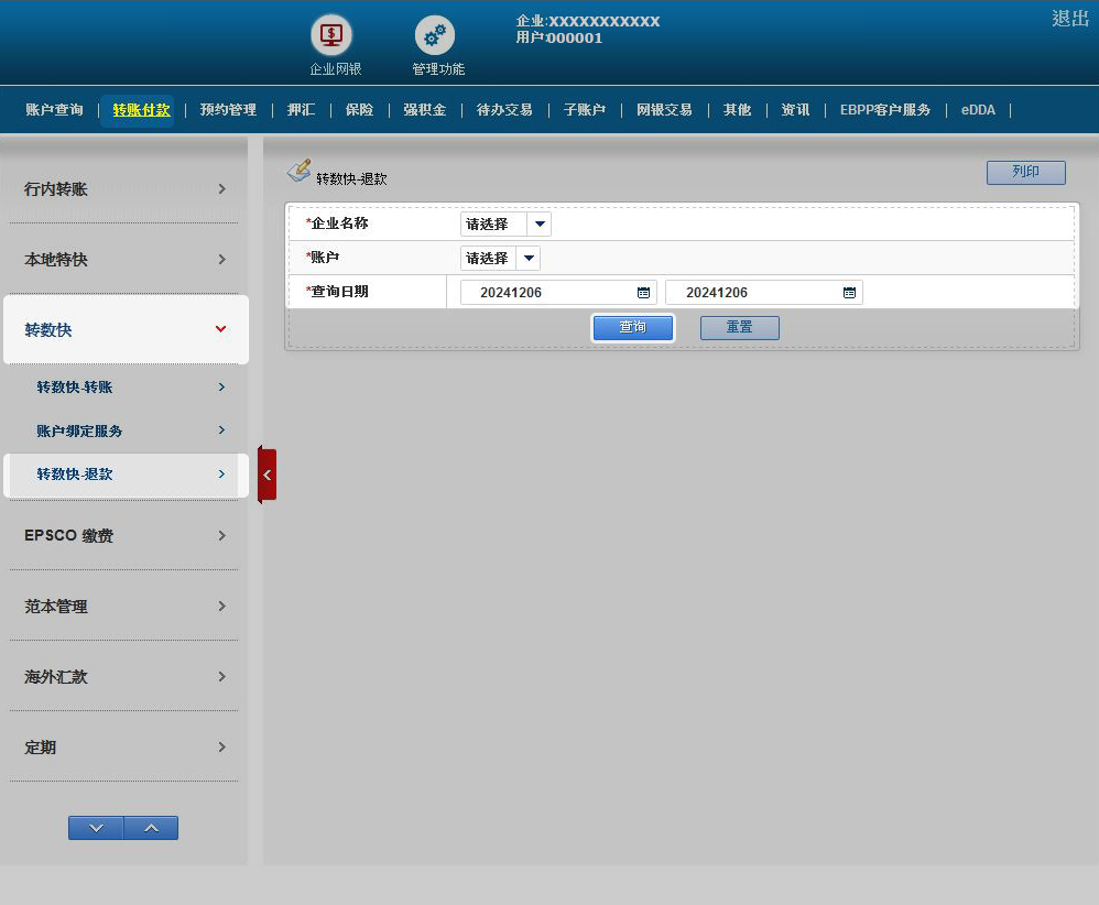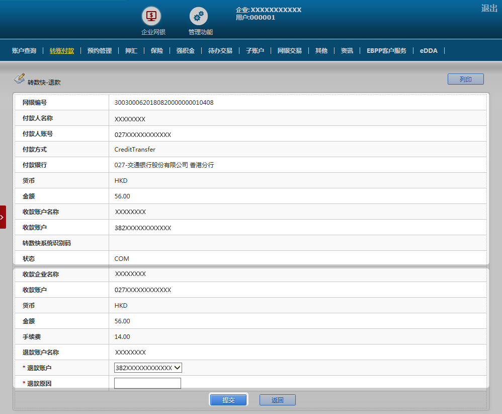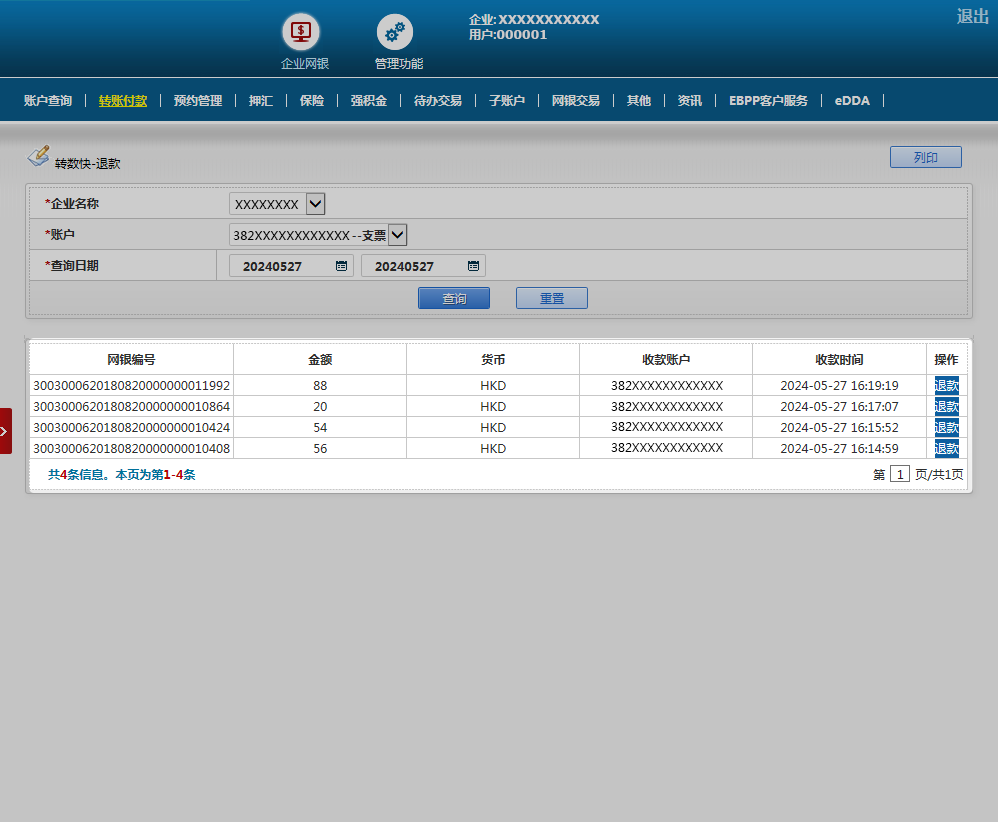 根据所选取的查询条件,显示经转数快收到的款项,并可按指定款项,按「退款」继续。