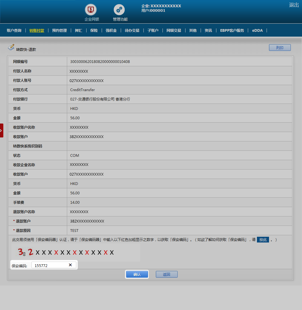 核对已输入的交易资料正确或更改有关资料后,请同时使用保安编码器进行认证,再按「确认」提交交易指示。