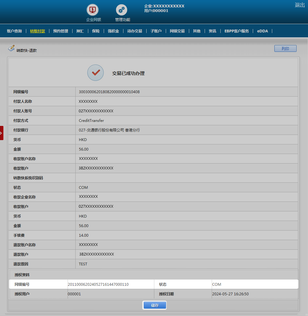 交易完成后,页面将显示交易成功及网银编号。您可按「储存」有关页面以作记录。