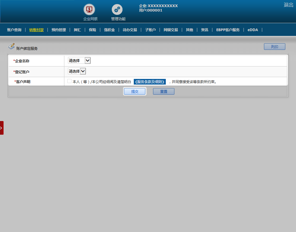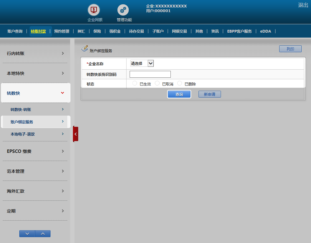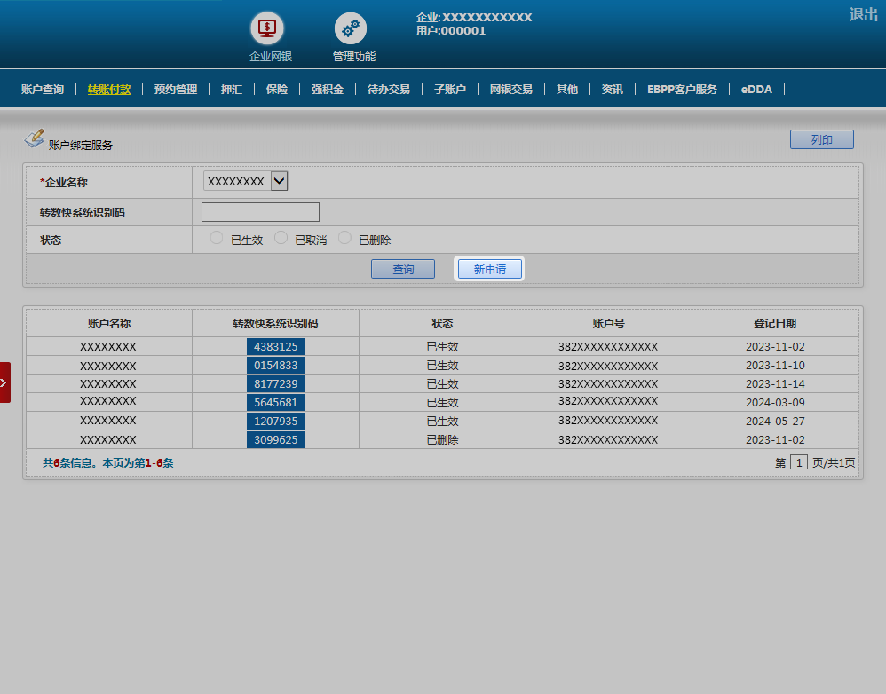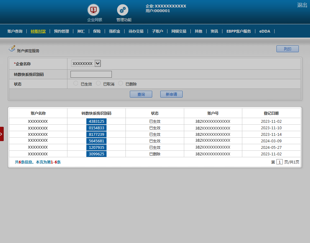 根据所选取的查询条件,显示出已登记账户绑定服务的账户及状态。