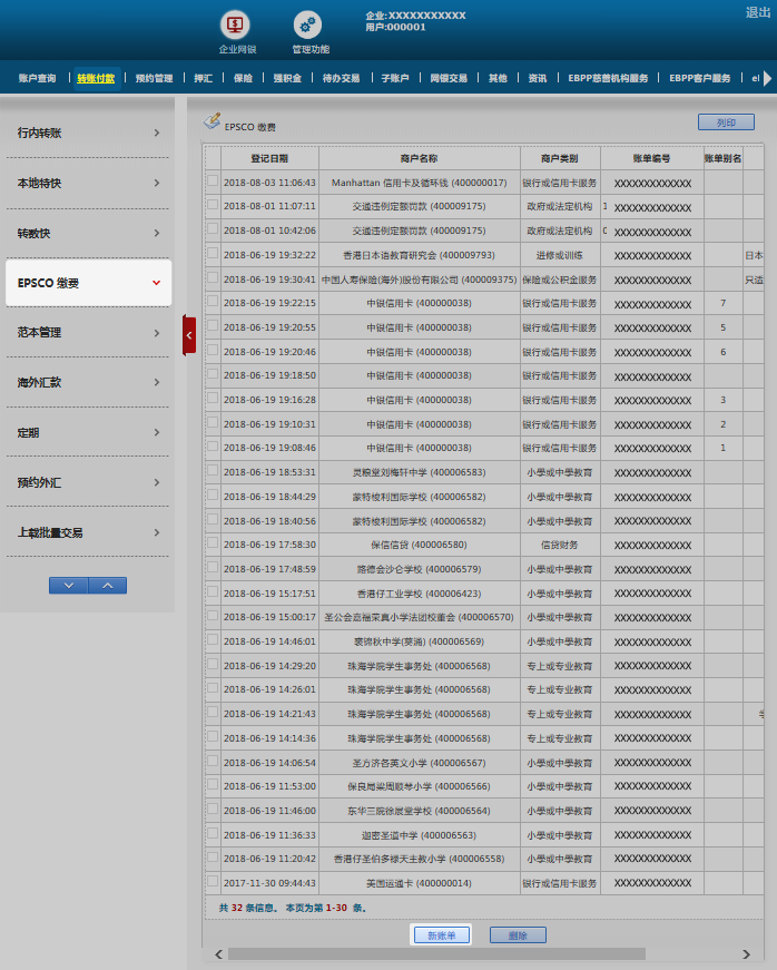 于「转账付款」选择「EPSCO缴费」,然后请点撃「新账单」。