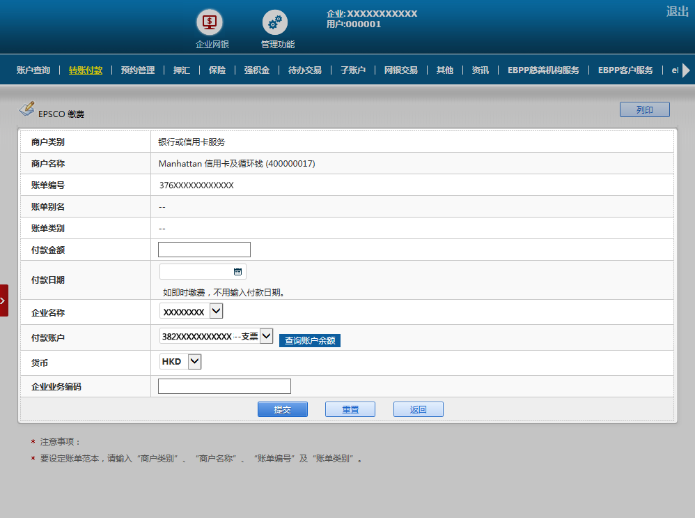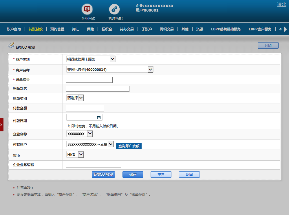 请按页面要求输入所需资料以开始登记账单,再按「EPSCO缴费」继续。