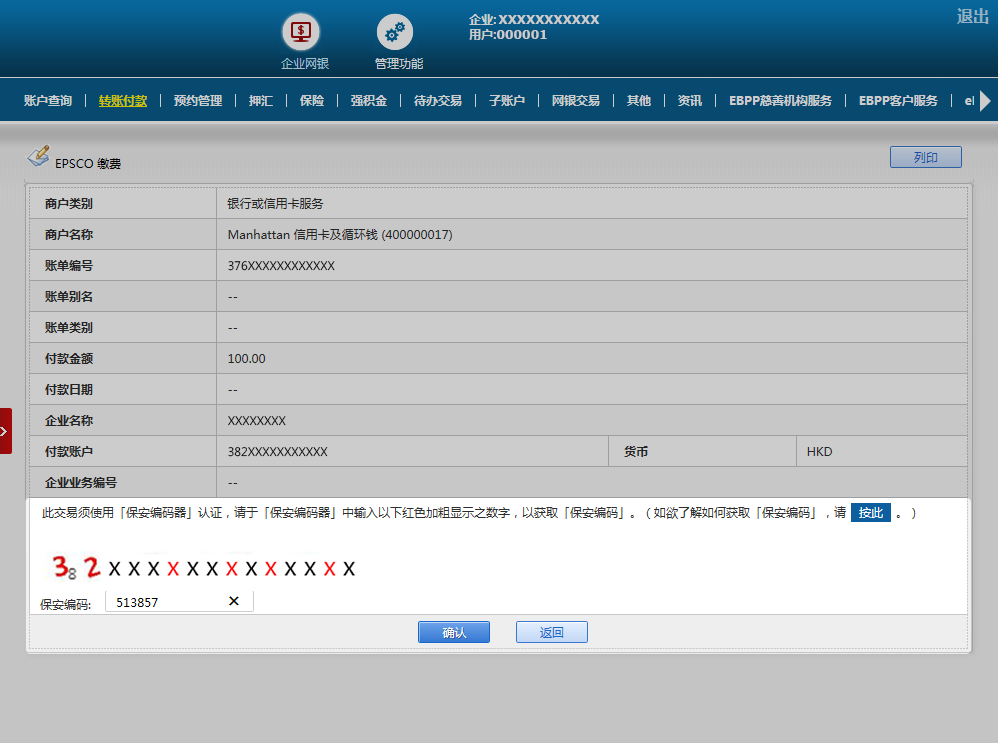 确认已输入的交易资料正确后请同时使用保安编码器及短讯密码进行双重认证再按「确认」。