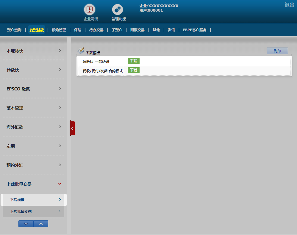 于「转账付款」选择「上载批量交易」中的「下载范本」,再拣选所需的范本按下载, 页面会弹出下载的方格,然后选择储存范本。