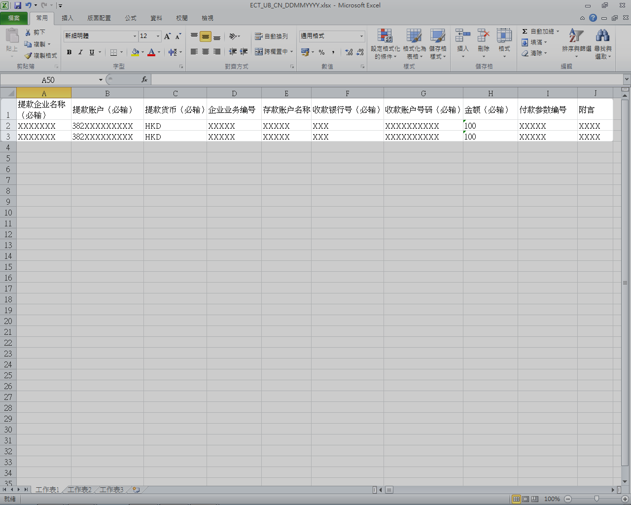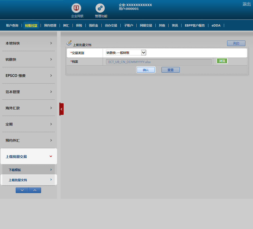 填写范本完毕后,请储存范本。并于「转账付款」选择「上载批量交易」,然后选择「上载批量文档」,于交易类别选择「转数快 - 一般转账」及上载已填写的范本。
