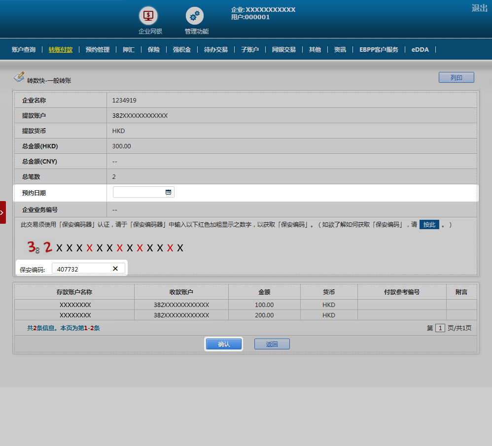 核对已输入的交易资料正确或更改有关资料,然后使用保安编码器进行认证,并按确认提交交易指示。