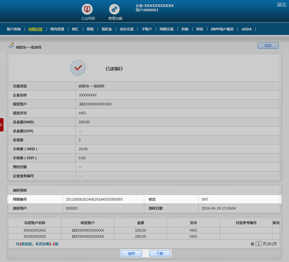 交易完成后,页面将显示交易成功及网银编号。您可按「储存」有关页面以作记录或按「下载」下载相关交易文档。