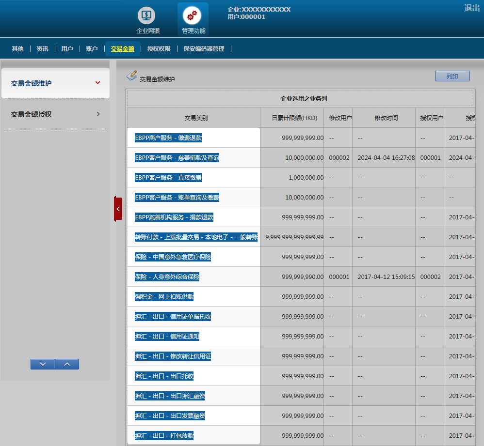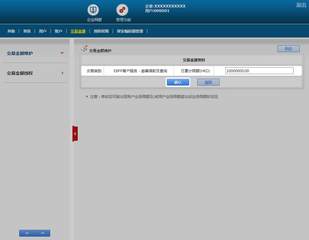 交易金额维护只供企业维护模式的客户进行限额修改,而银行维护模式模式的客户只可查询限额。