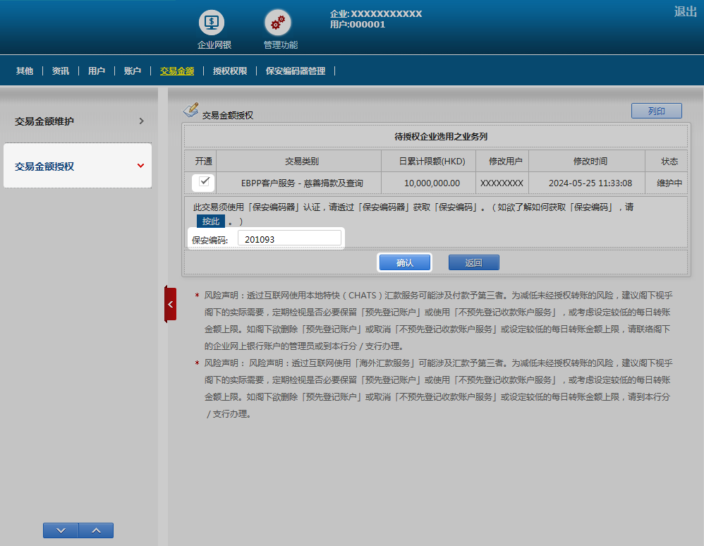 请安排另一位具授权权限的主管或管理人于「管理功能」选择「交易金额授权」后剔选相关交易类别并按下「授权」,再输入保安编码器并按「确认」。