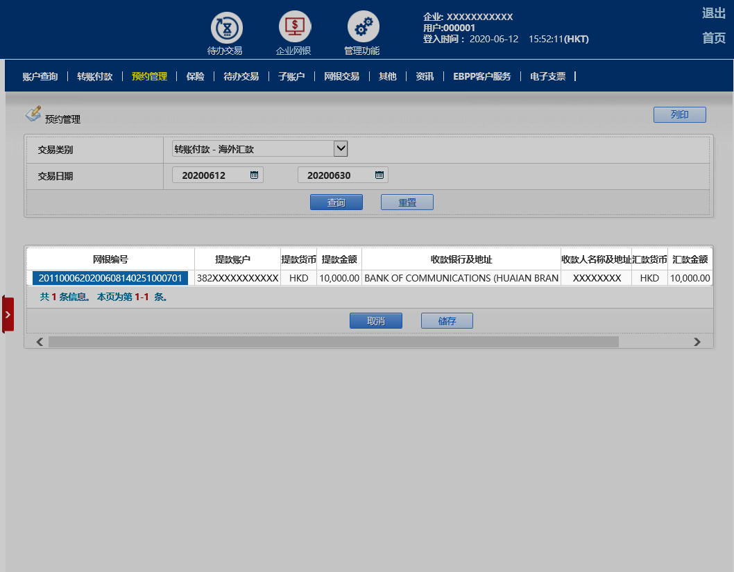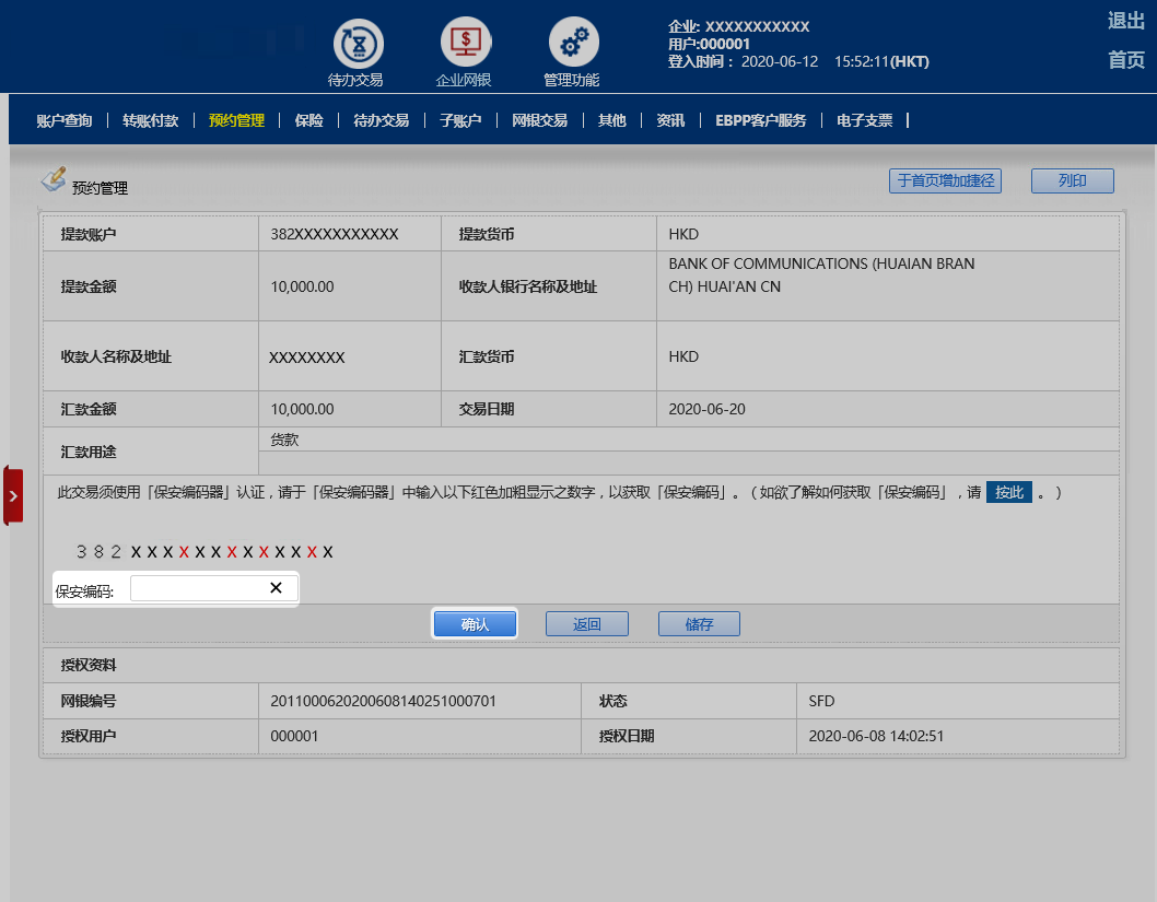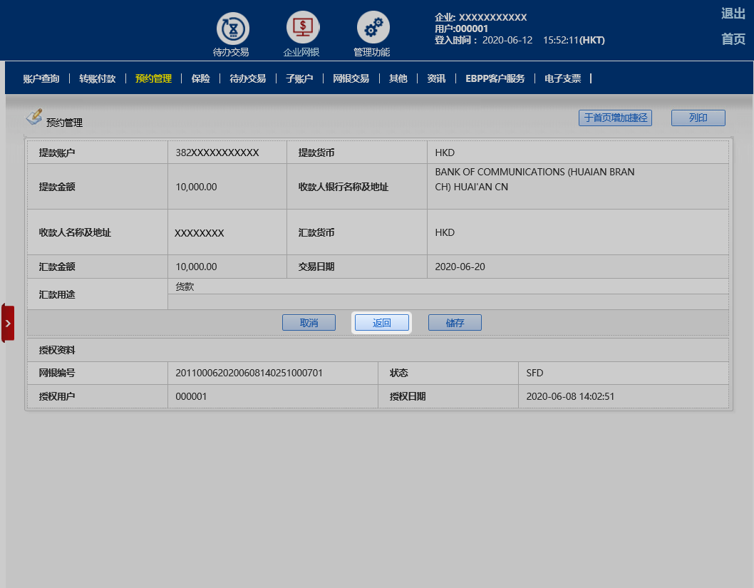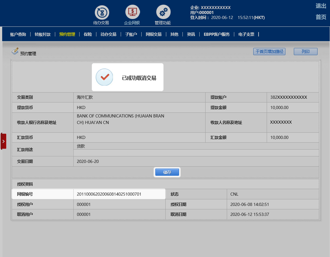 交易完成后,页面显示取消交易成功及网银编号。您可按「储存」有关页面以作纪录。如需要授权,请按待办交易继续。