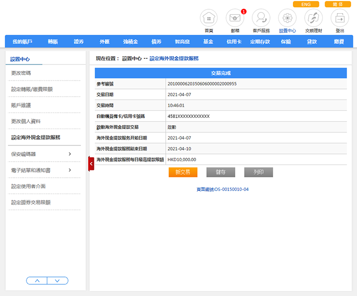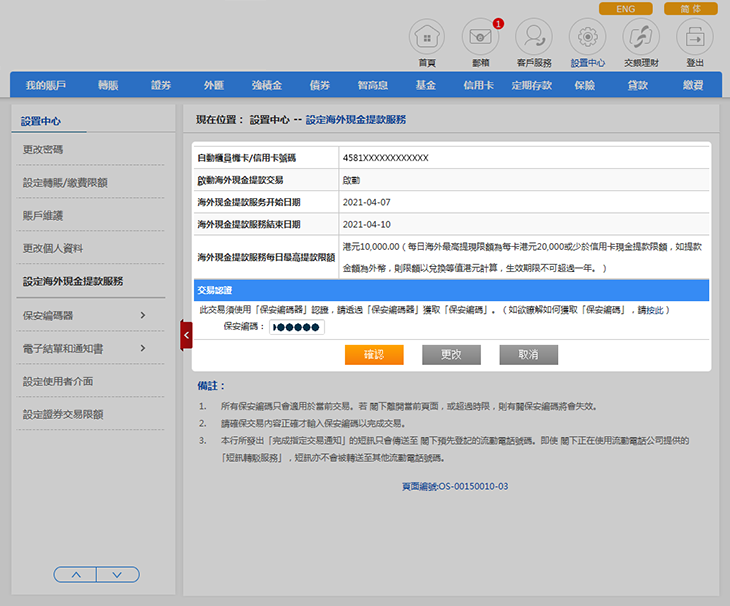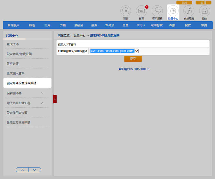 于「设置中心」一栏选择「设定海外现金提款服务」,然后选择欲设定服务的柜员机卡或信用卡,然后按「提交」。