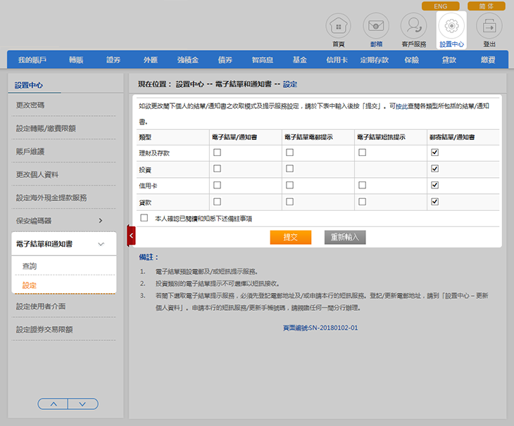 您可于「设置中心」一栏选择「电子结单和通知书」中的「设定」更改阁下个人的结单/通知书为收取电子版及提示服务模式,然后按「提交」。