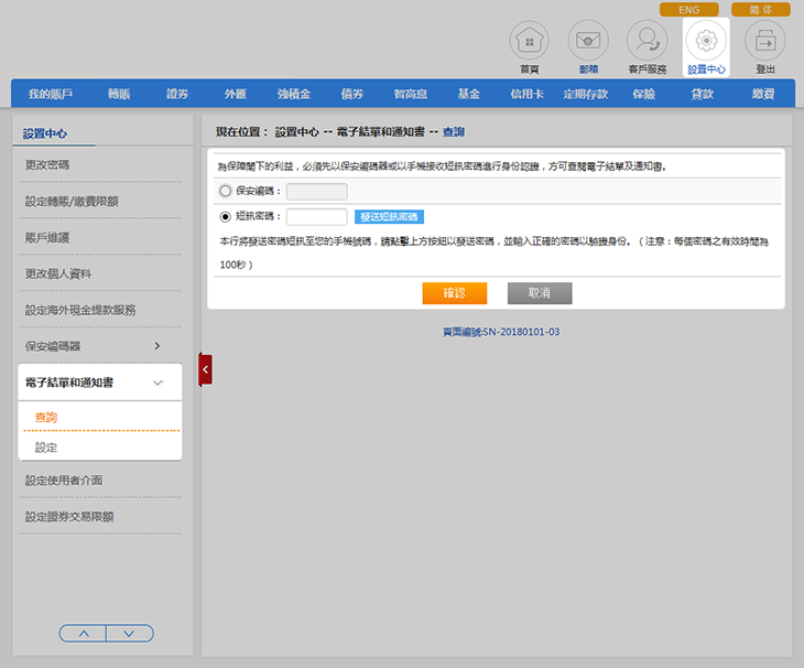于「设置中心」一栏选择「电子结单和通知书」中的「查询」,然后使用保安编码器或短讯密码进行双重认证,再按「确认」。