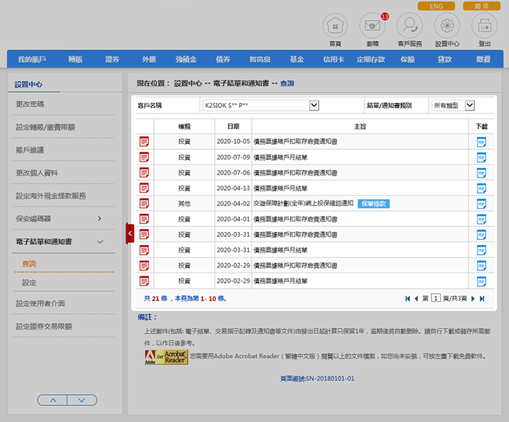 阁下可于「客户名称」选择您的户口名称及从「结单/通知书类别」点选查询的电子结单和通知书进行下载。