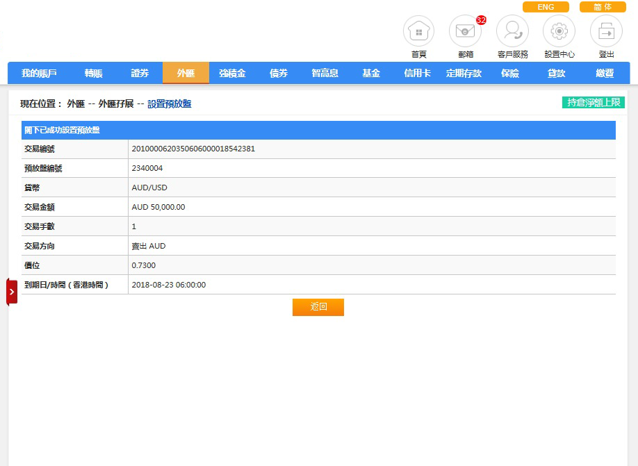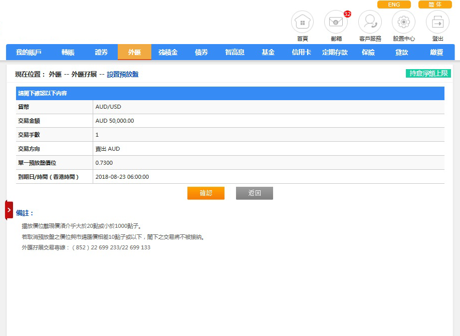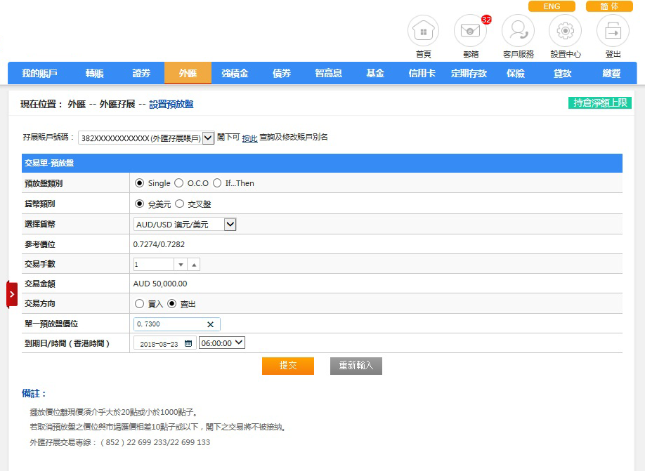 请选择预放盘类别、交易货币组合、买卖指示(买入或沽出)及交易手数、预放盘价位及到期日/时间,完成后请按「提交」。如欲重设,请按「重新输入」。