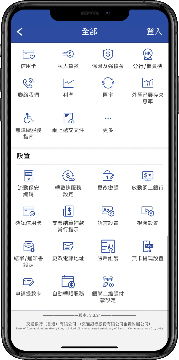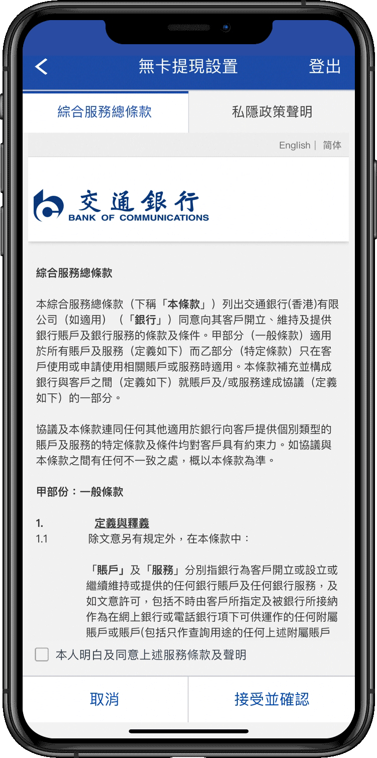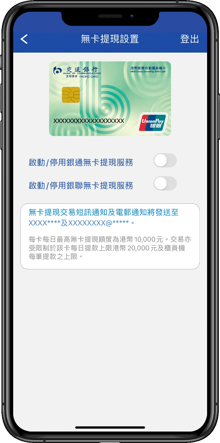 透過「交通銀行(香港)」手機應用程式,以流動保安編碼或生物認證登入。在目錄中選擇無卡提現設置。