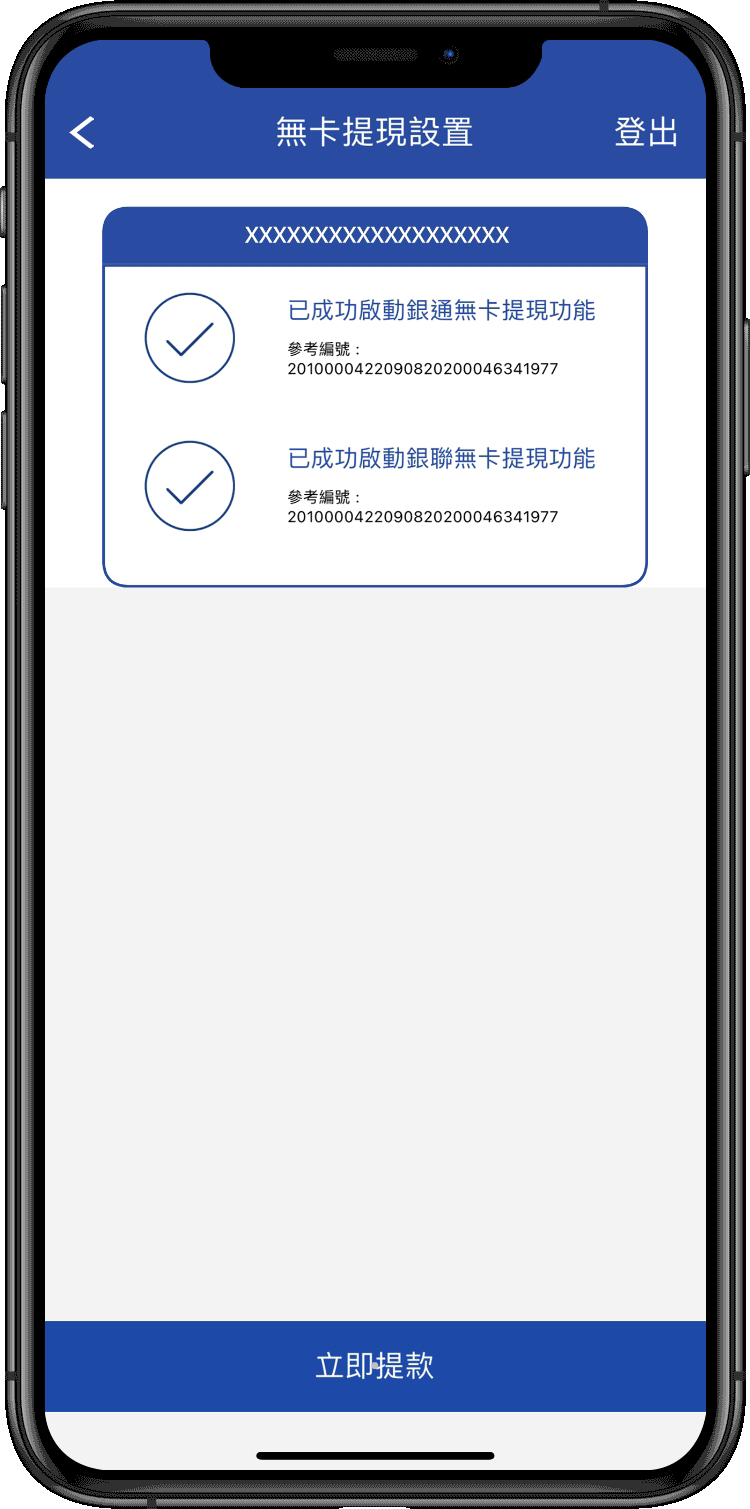 藍框內指定提款卡的銀通及銀聯無卡提現服務已成功啟動。點選立即提款進行無卡提現服務。我們將會向您已登記的流動電話號碼及電郵地址發送成功啟動服務的短訊。