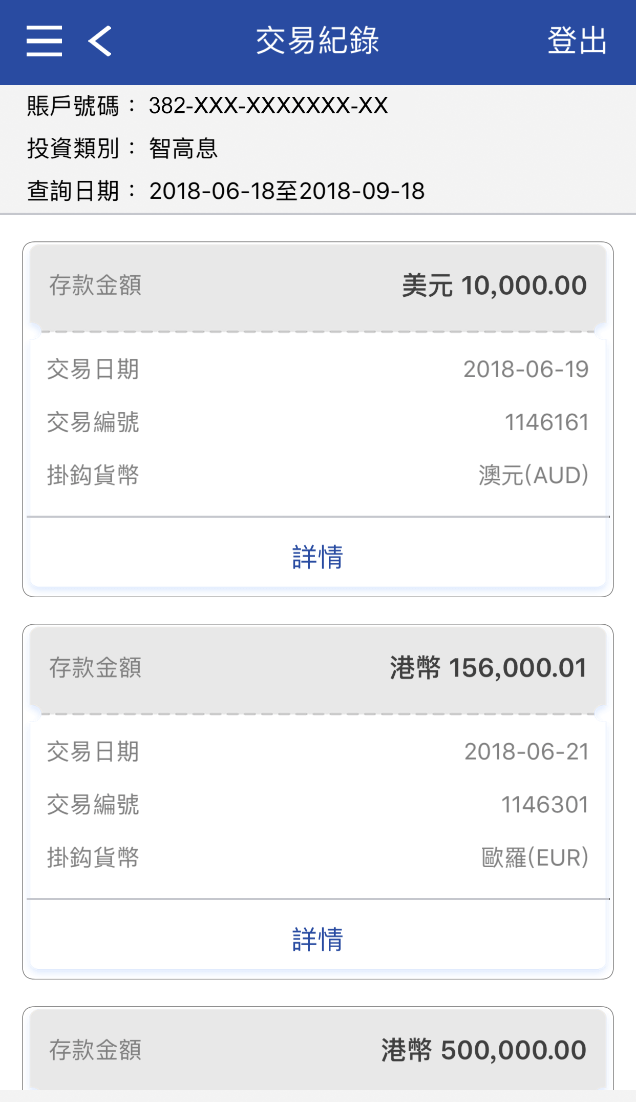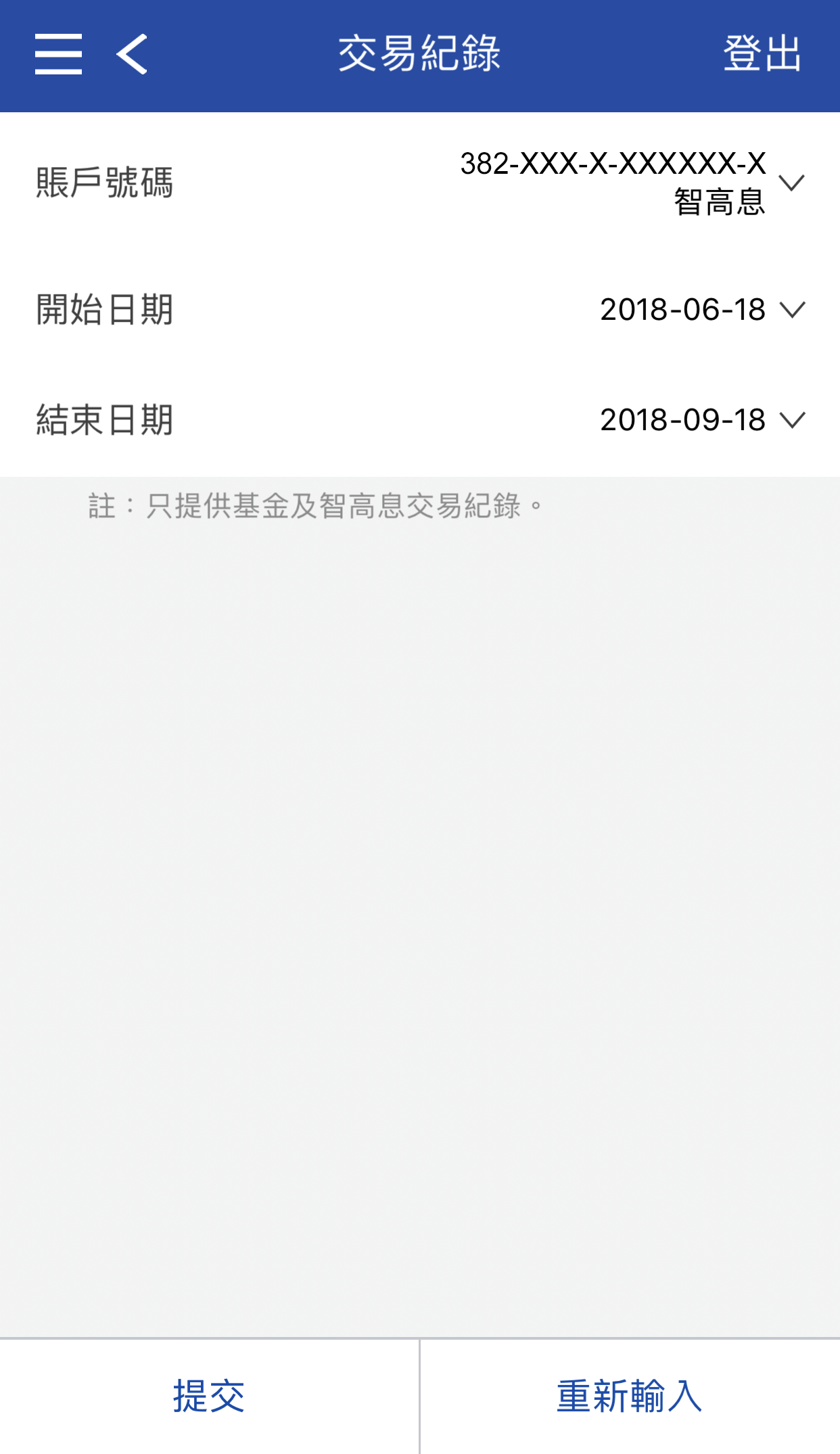於賬戶號碼選擇要查詢的賬戶,可查詢最近三年的交易紀錄。