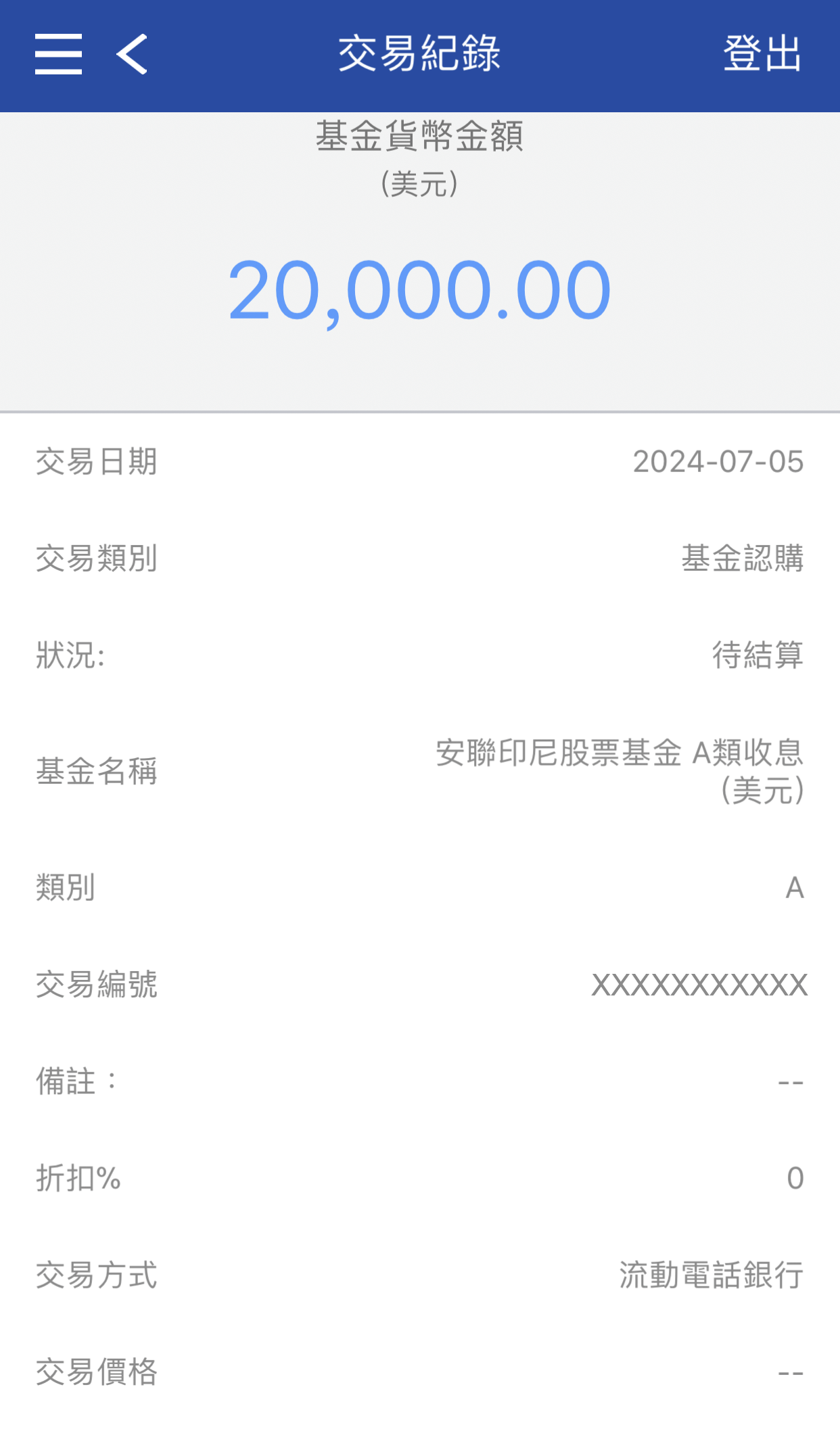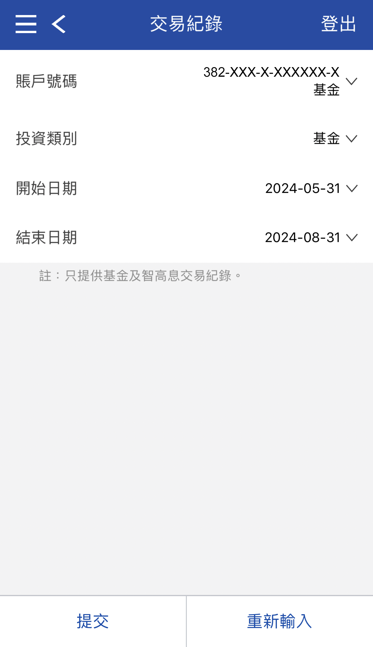 於賬戶號碼選擇要查詢的賬戶,可查詢最近三年的交易紀錄。
