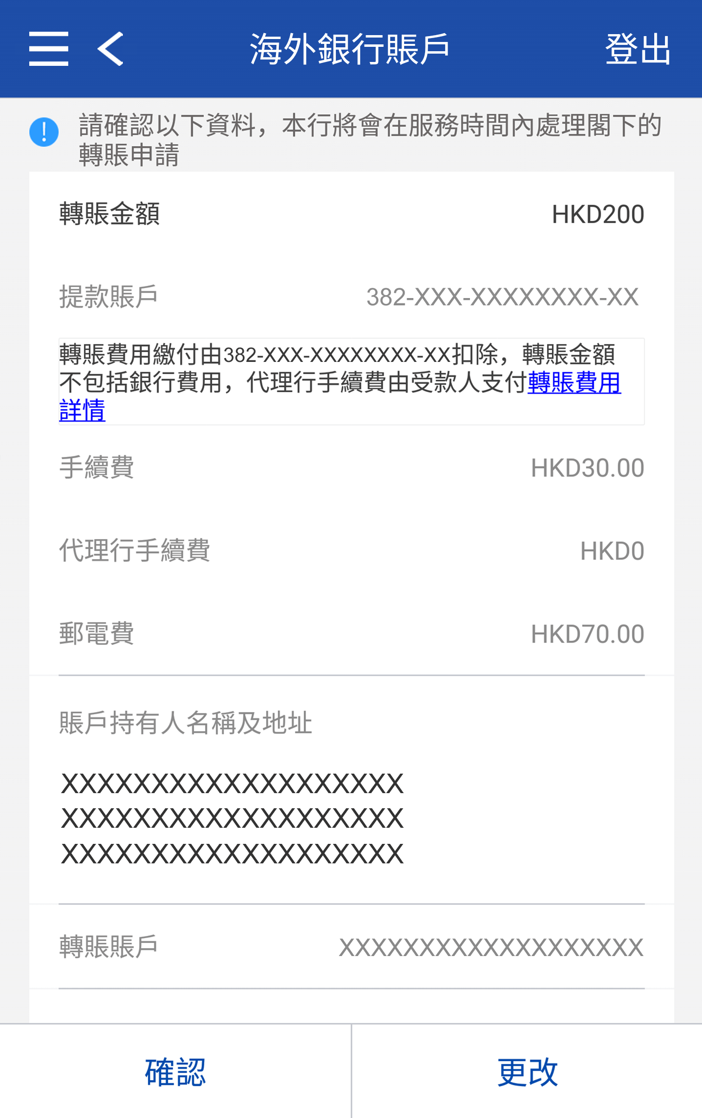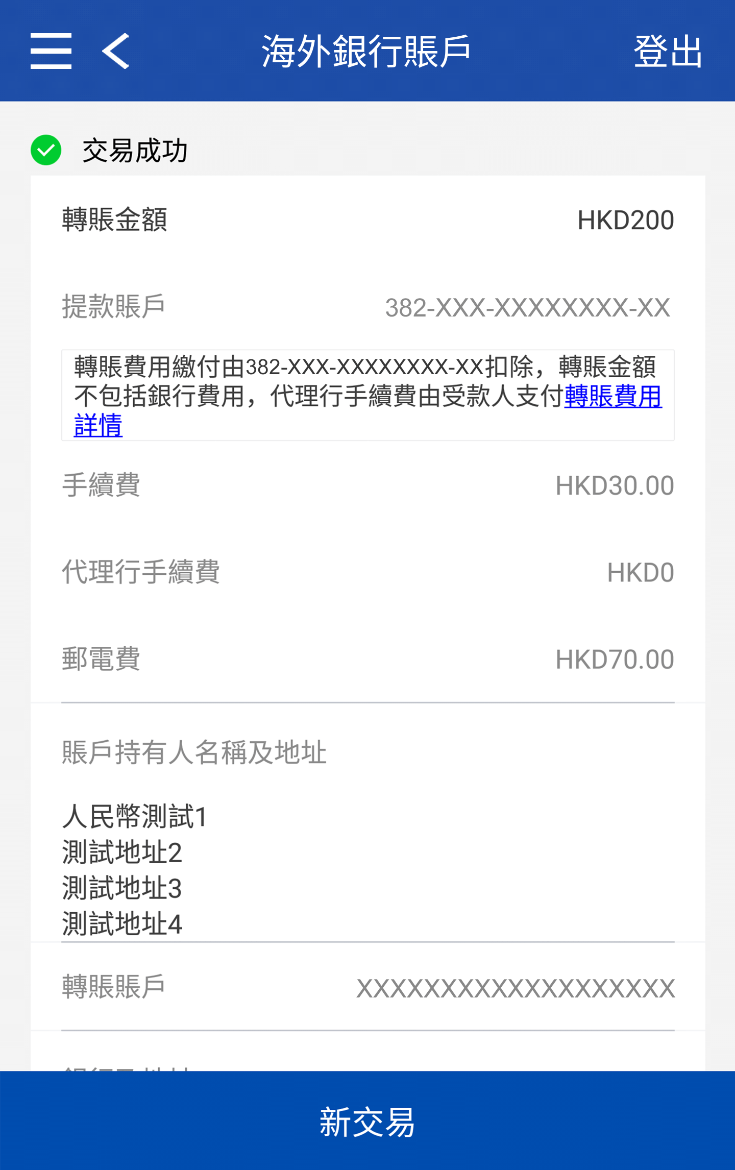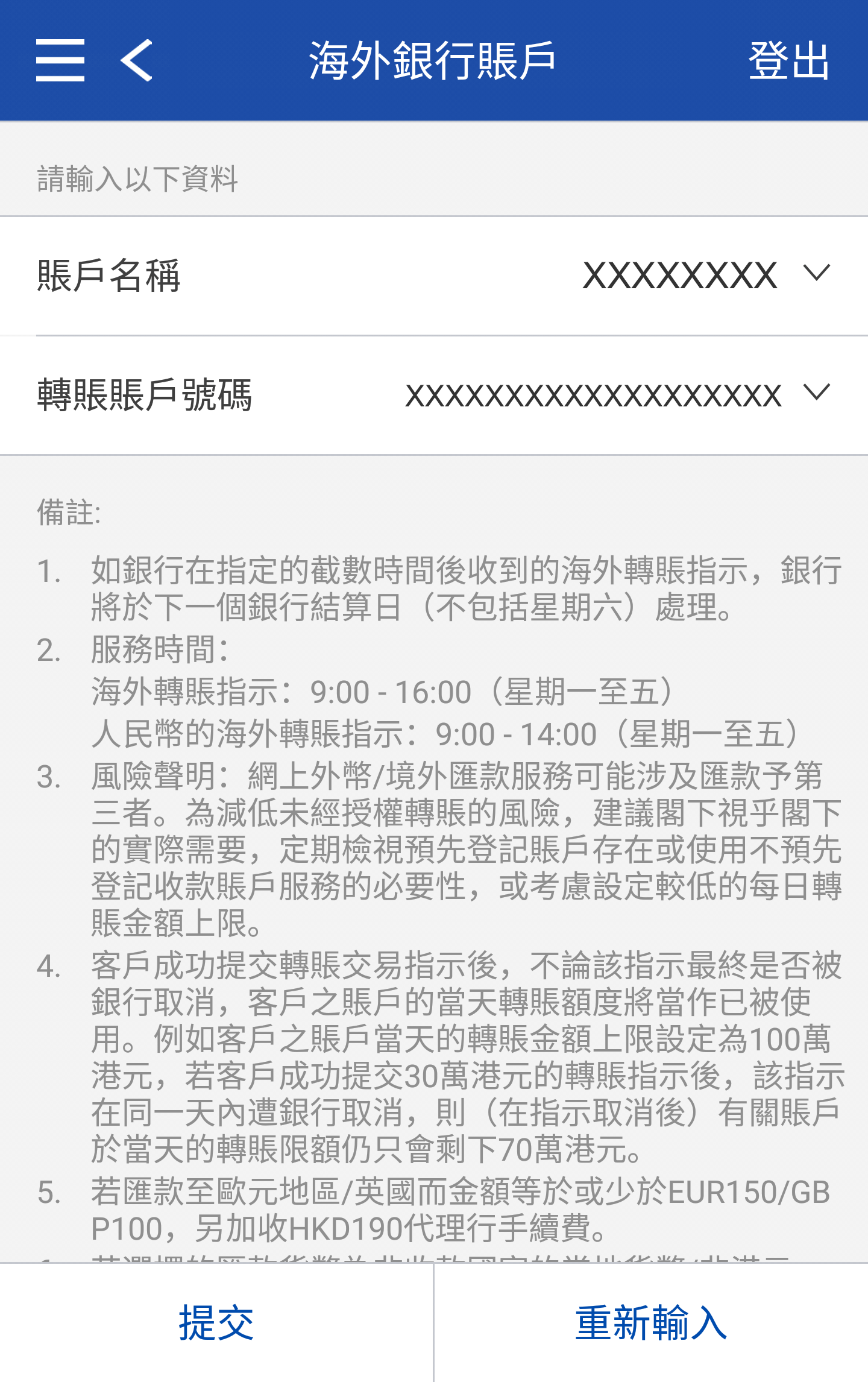 於轉賬選擇海外銀行轉賬,然後於右方位置選擇或輸入所需交易資料,再按提交。