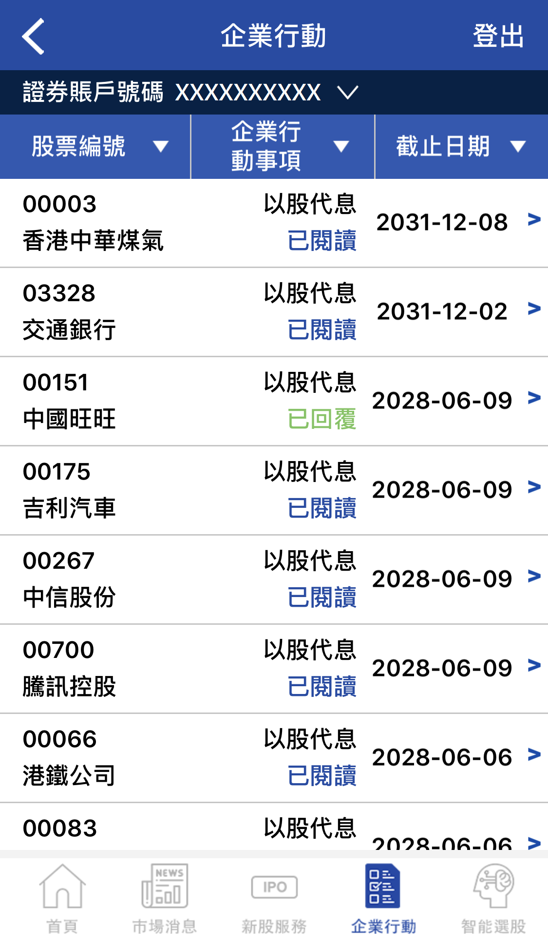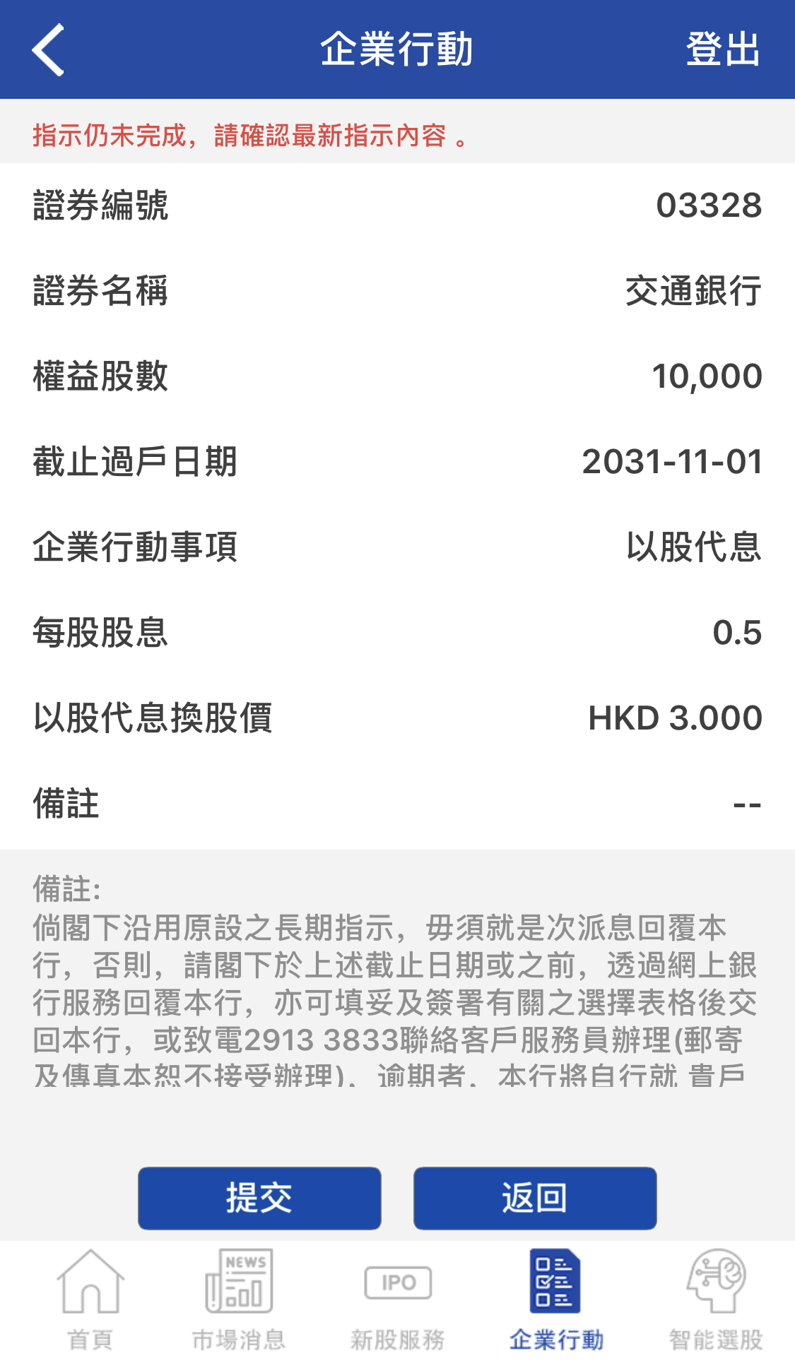 註:選項會因應不同的企業行動而有所改變,圖例為「以股代息」內容。