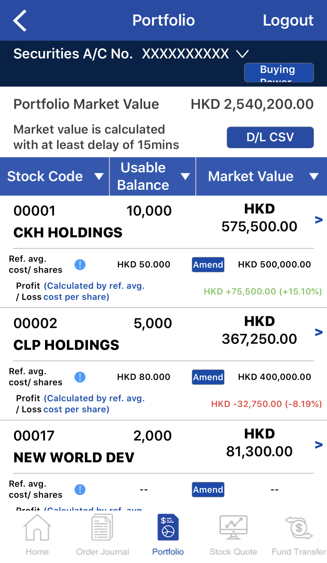 Porfolio illustrates the portfolio of all stocks in the account, including Usable Balance, Profit/Loss and Market Value.