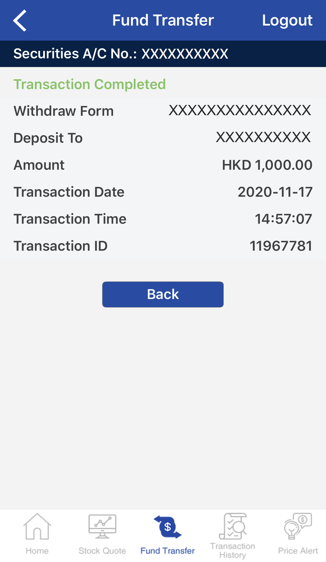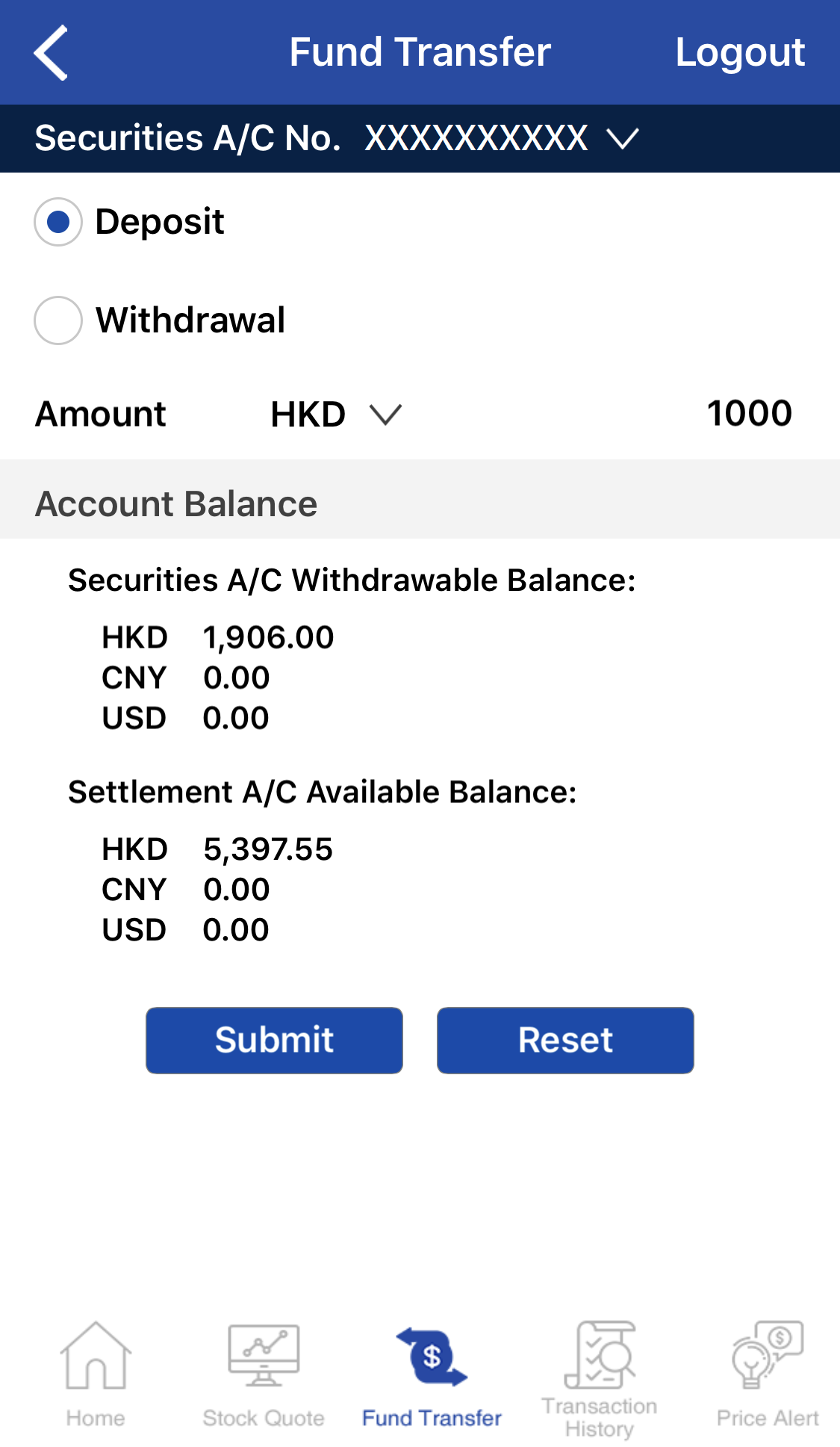 Select either Deposit/Withdrawal from Securities Account. Select Currency and transfer amount, and then tap Submit.