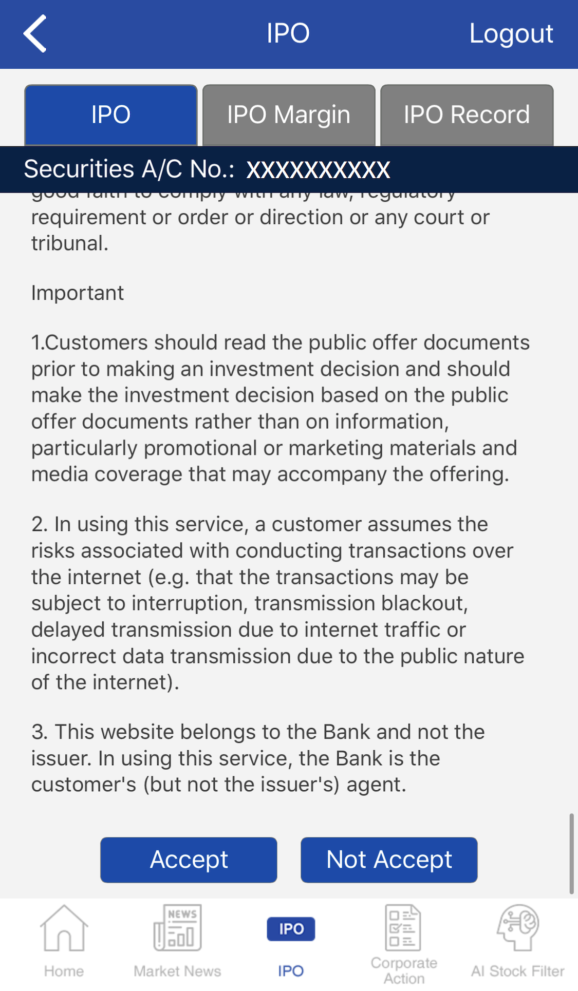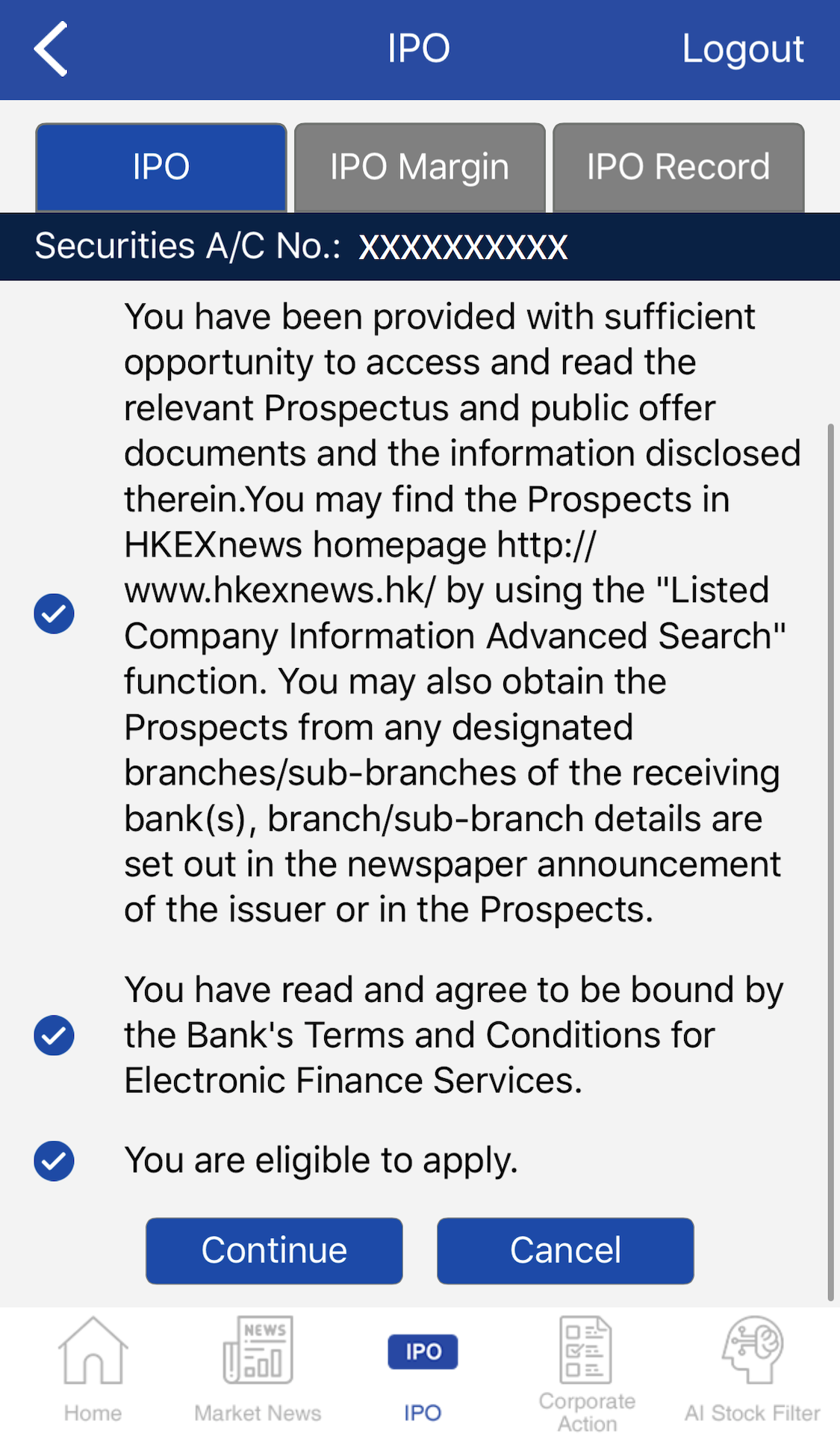 Confirm to have read the prospectus, terms and conditions and eligible to apply, and then tap Continue to proceed.