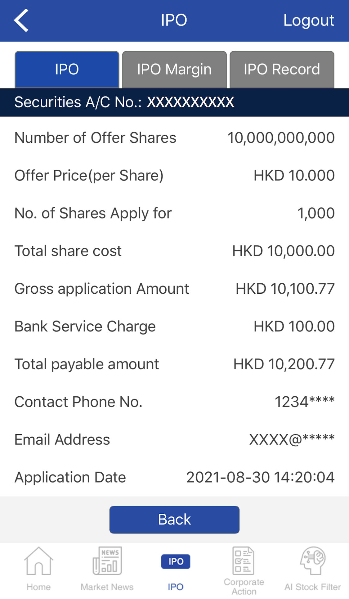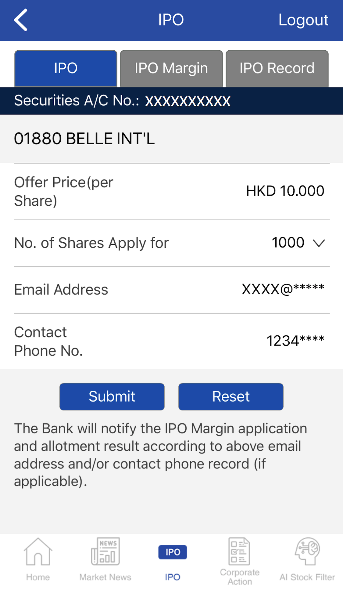 After entering No. of Shares Apply for, the system will automatically show the registered Email Address and Contact Phone No. Tap Submit to proceed.