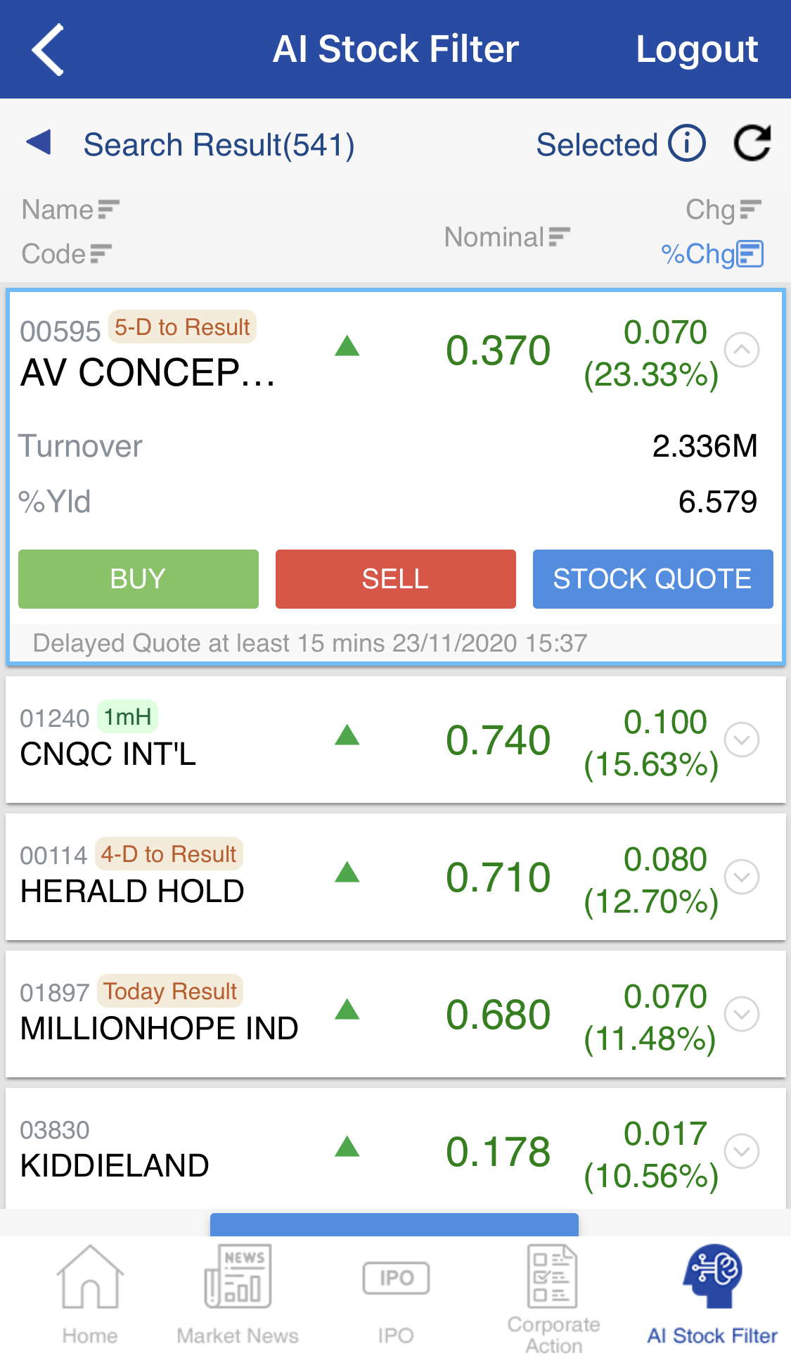 In the search results, customers can click buy or sell to trade, also they can click on stock quote to display detailed information about selected stocks.