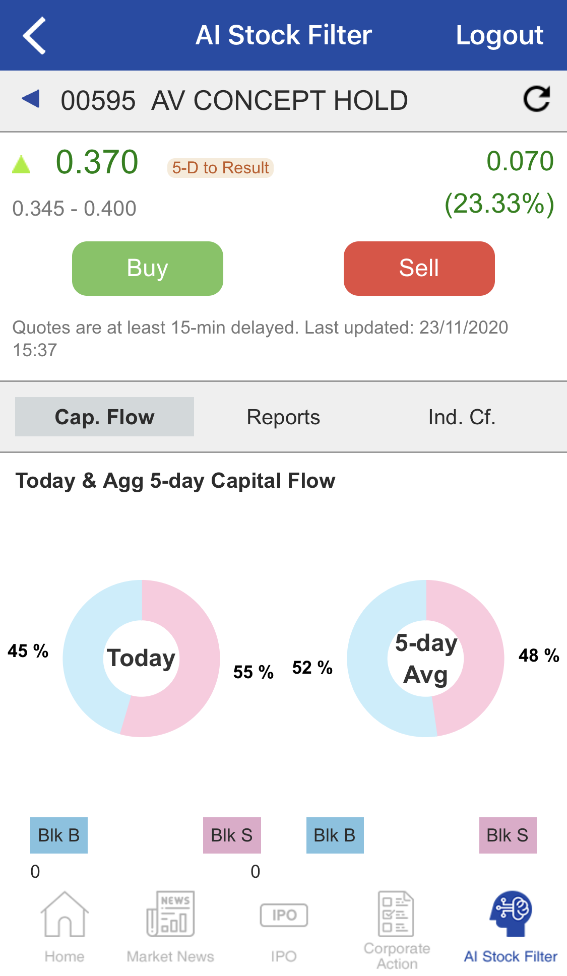 The stock information page displays the Captial Flow of selected stocks, Reports and Industry Comparison information.