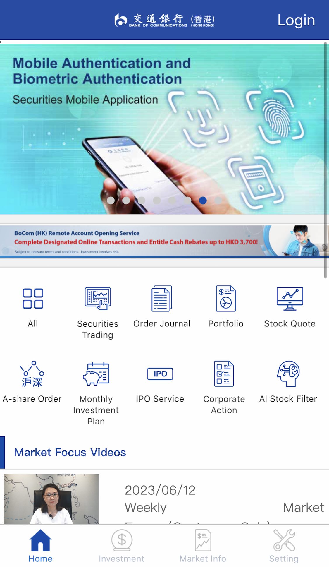 Download or update "BOCOM(HK) Securities" Mobile app, then login with your Username and Password.