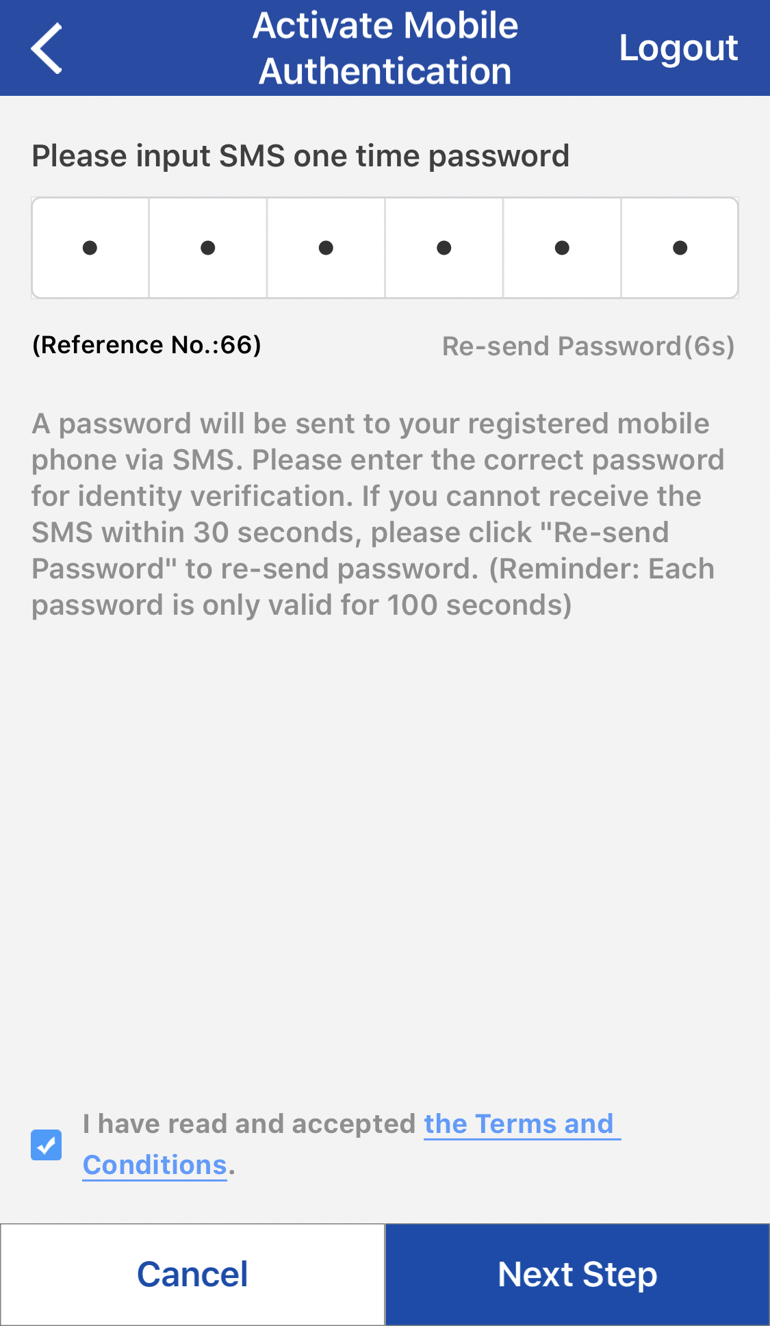 Input "SMS Password" for verification, and confirm the Terms and Conditions.