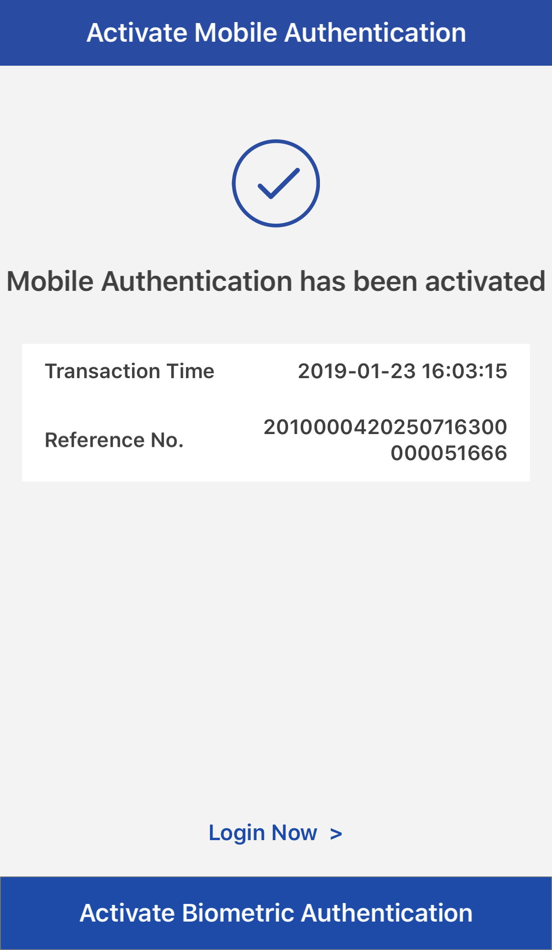 Mobile Authentication has been activated successfully. You can now log onto Securities Mobile App using your "Mobile Authentication Password". You may also click "Activate Biometric Authentication" to activate Biometric Authentication.